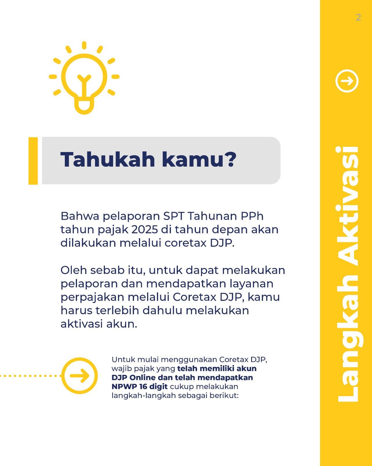 apakah sudah aktivasi akun Coretax DJP? Yuks, siapkan diri untuk pelaporan SPT Tahunan PPh 2025 yang akan dilakukan melalui Coretax DJP. Aktivasi akun cukup mudah, terutama bagi kamu yang sudah punya NPWP 16 digit dan akun DJP Online.