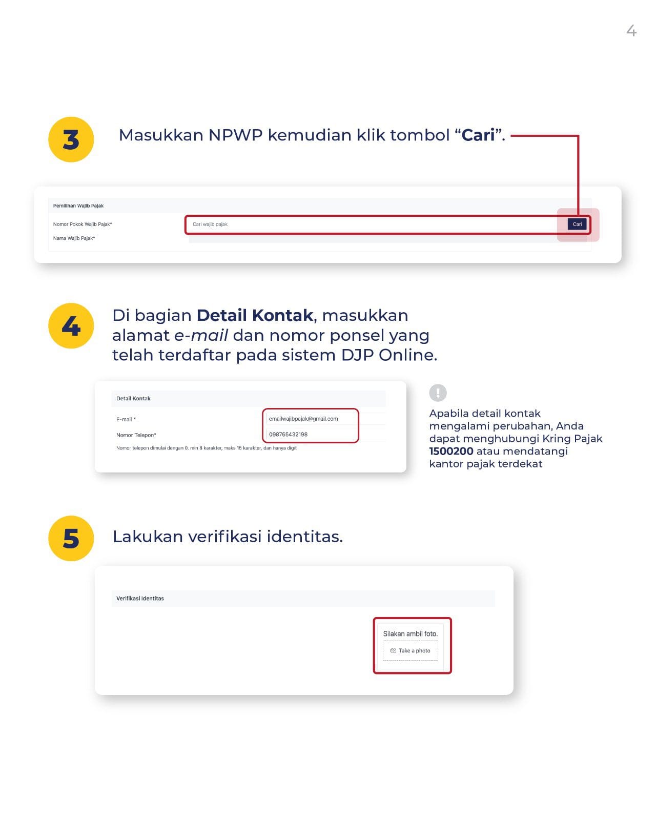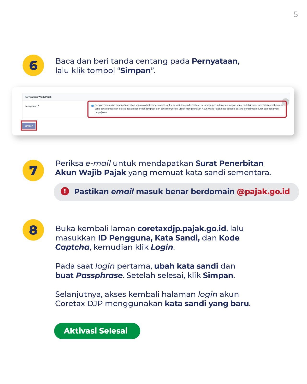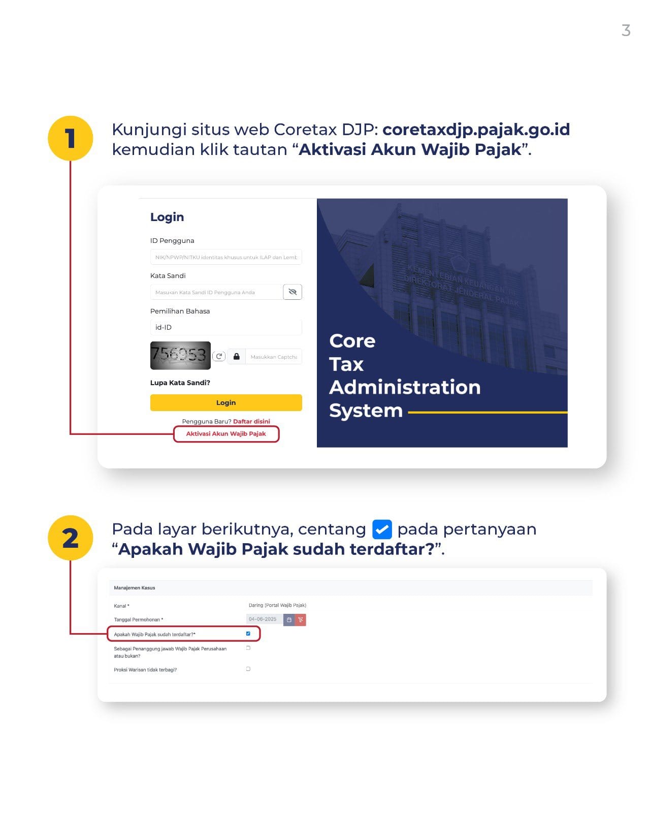 Berikut ini langkah aktivasi akun wajib pajak, mulai dari akses laman http://coretaxdjp.pajak.go.id, lalu lakukan aktivasi dengan mengisi NPWP dan alamat email dan nomor ponsel yang telah terdaftar di DJP Online. Setelah itu, lakukan verifikasi dan periksa email untuk mendapatkan Surat Penerbitan Akun Wajib Pajak.