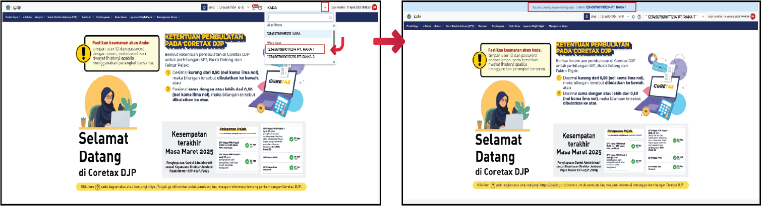 - Sistem akan menampilkan notifikasi bahwa Anda menggunakan Coretax DJP dalam mode impersonate untuk wajib pajak yang Anda wakili.