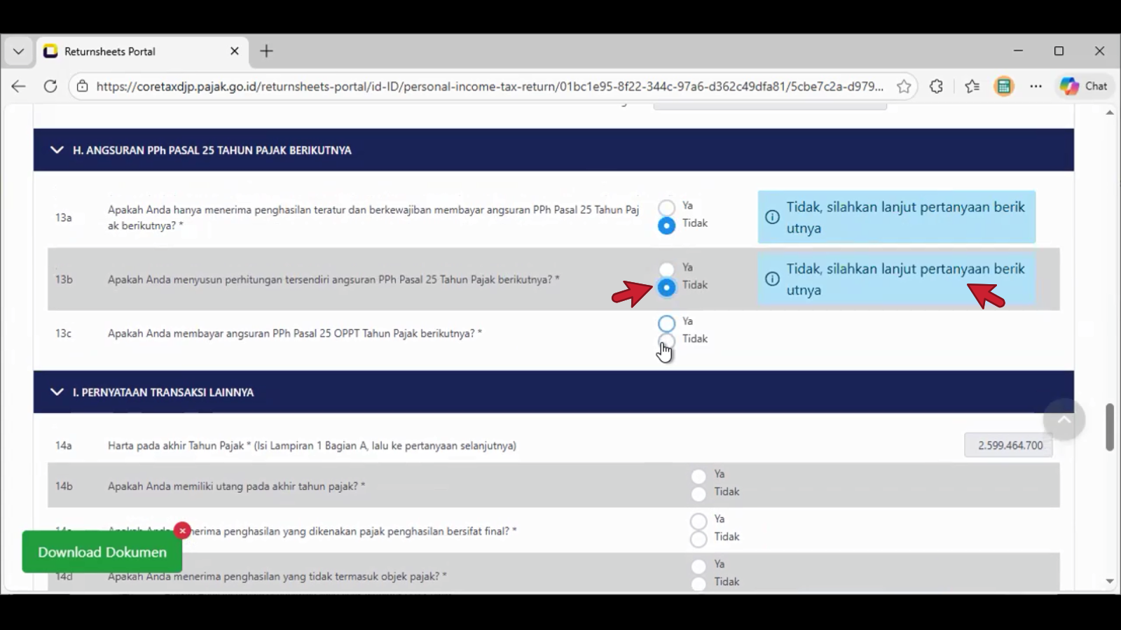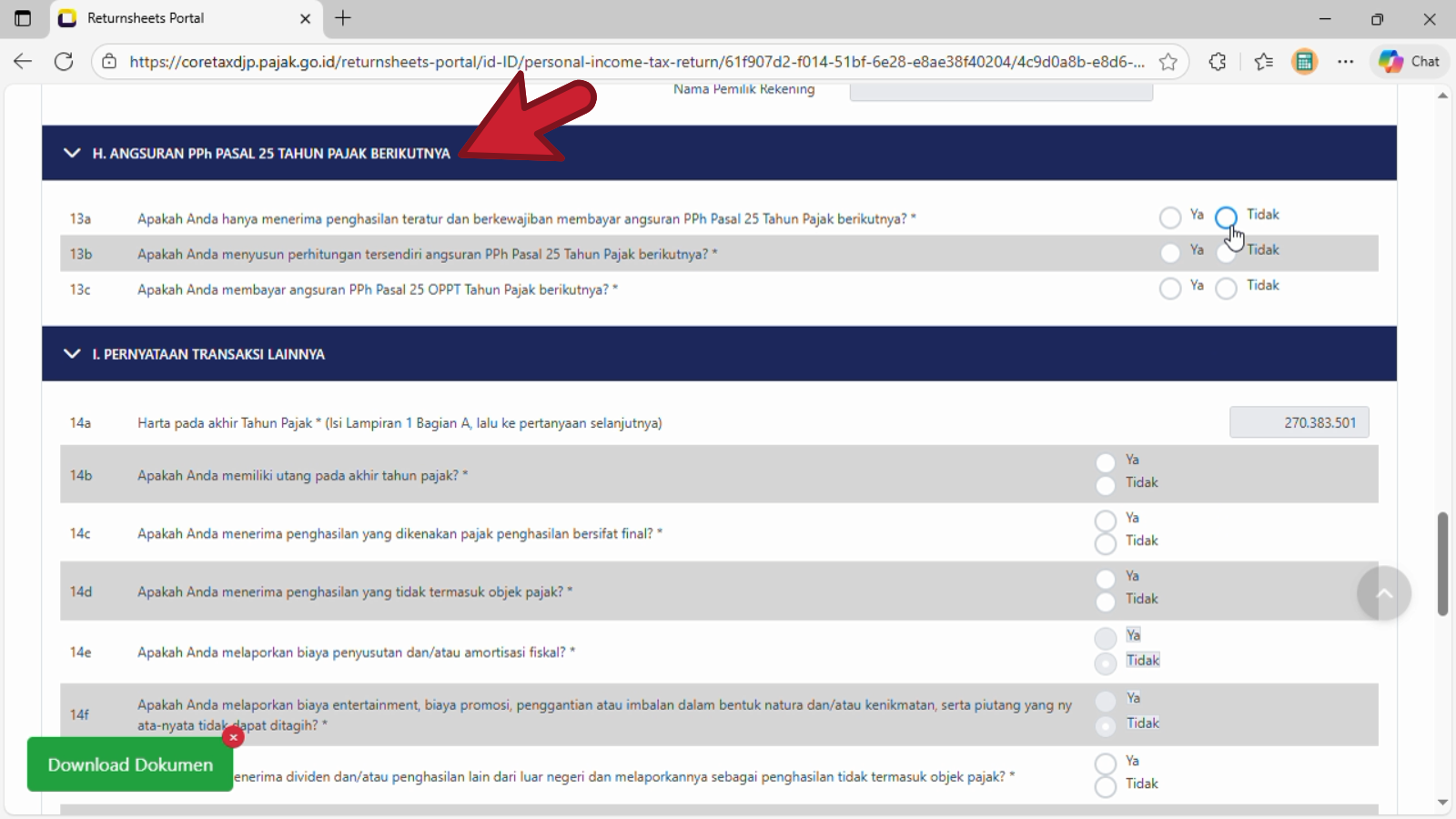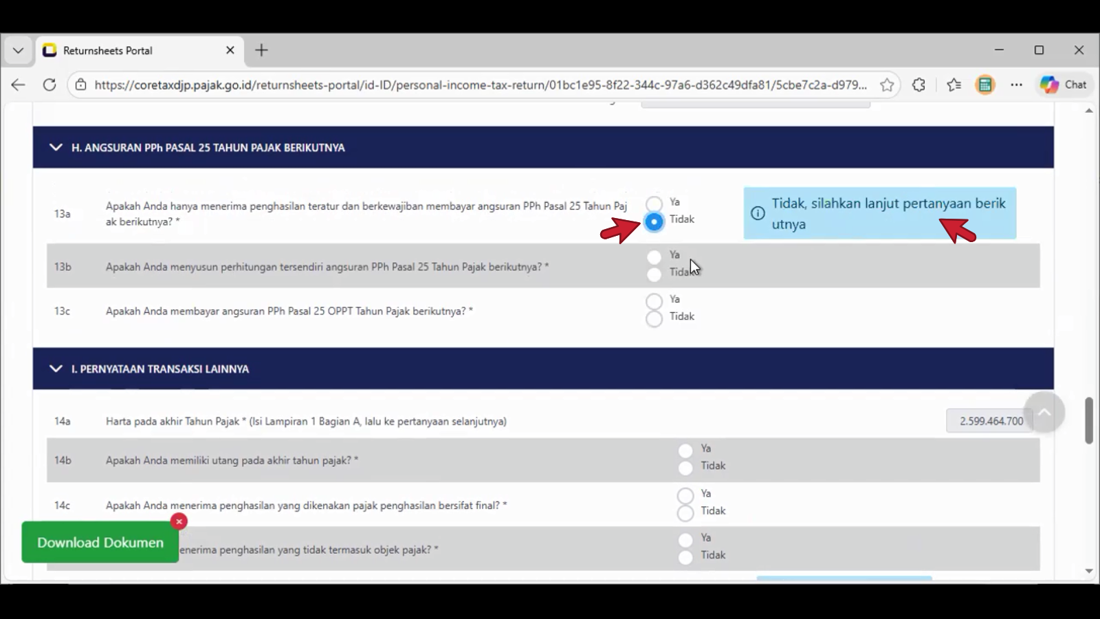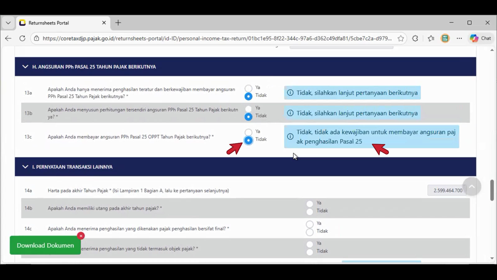 Pilih bulatan jawaban Tidak dan notifikasi pada sisi kanan adalah: Tidak, tidak ada kewajiban untuk membayar angsuran pajak penghasilan Pasal 25.