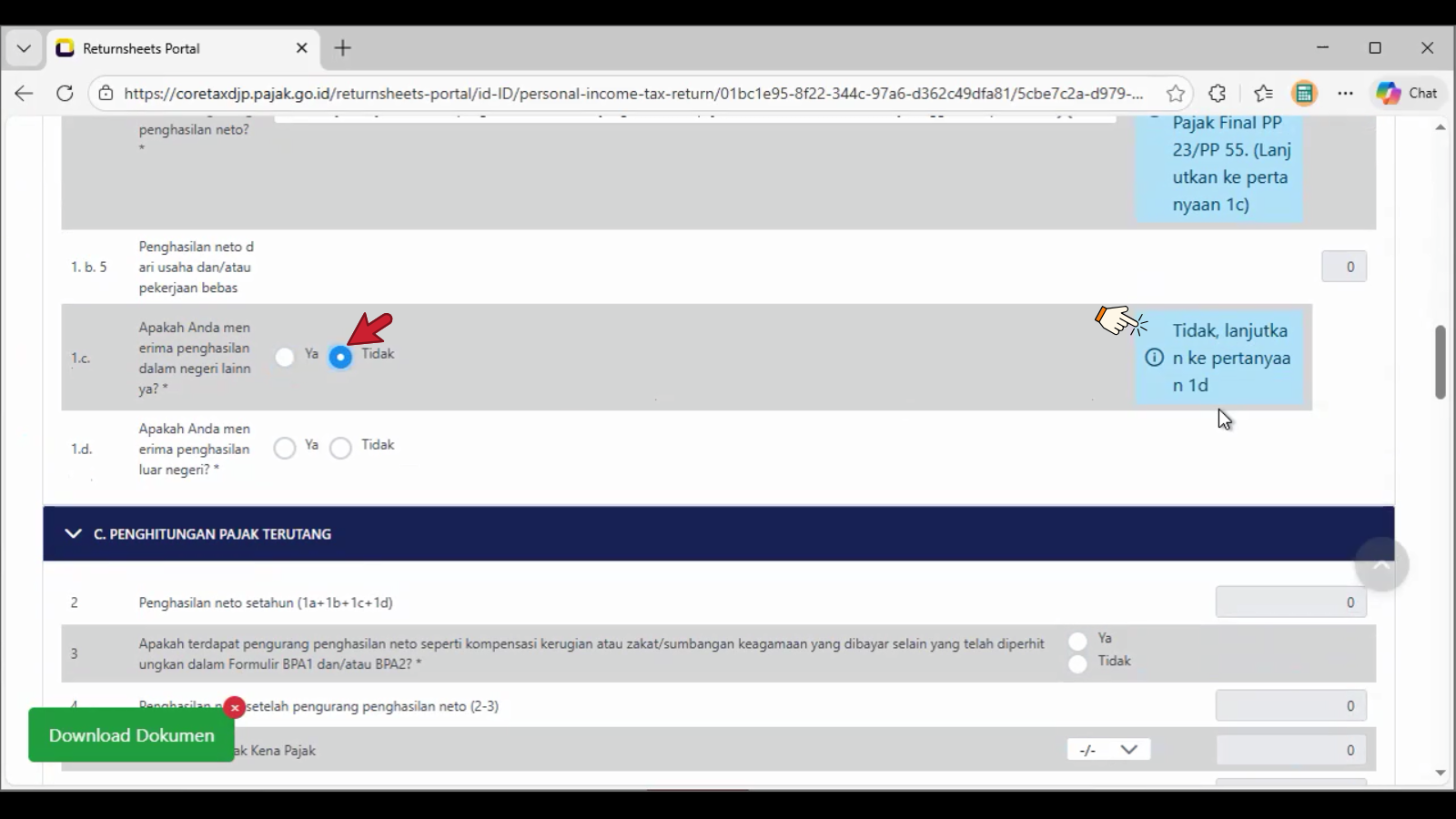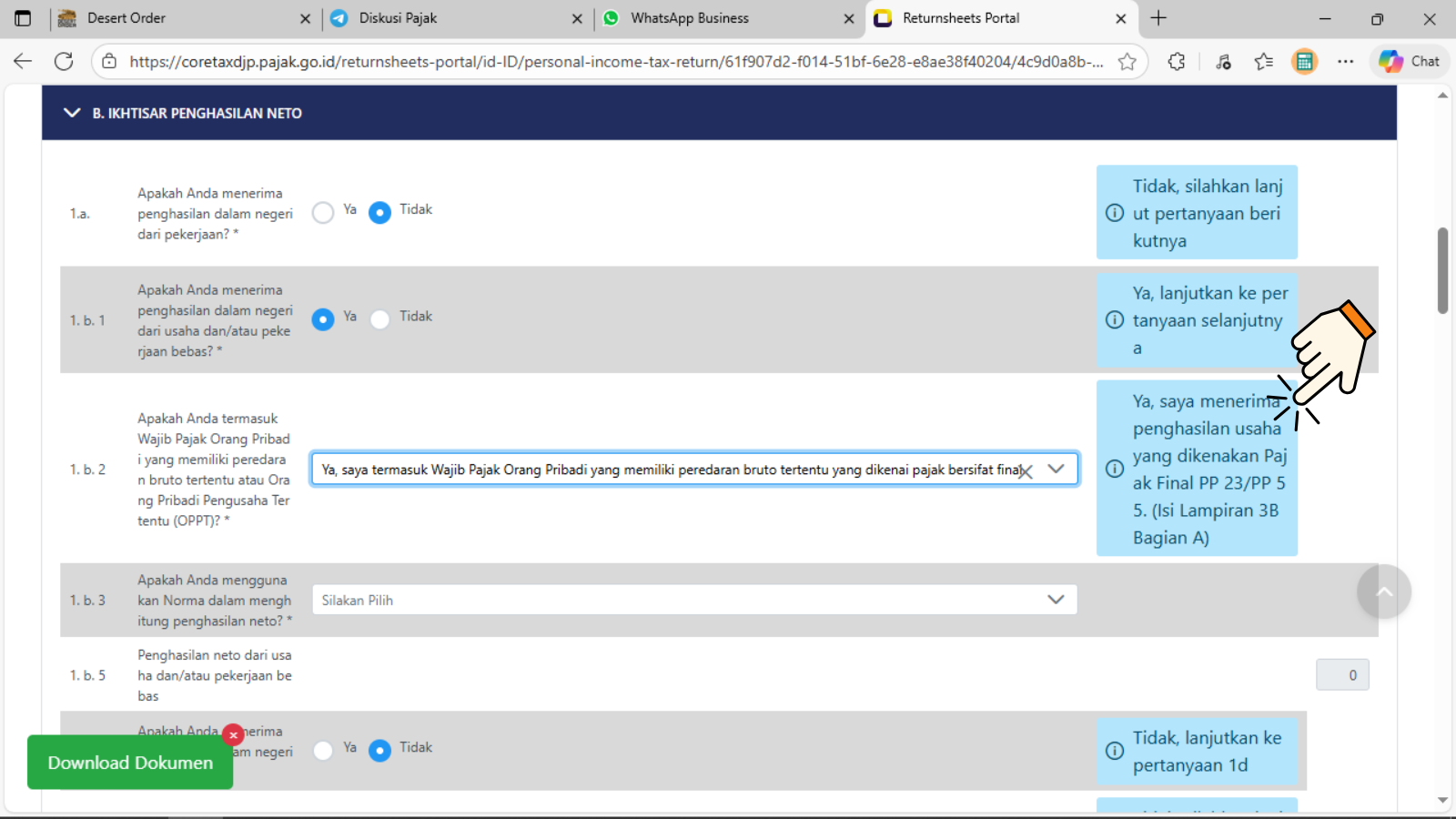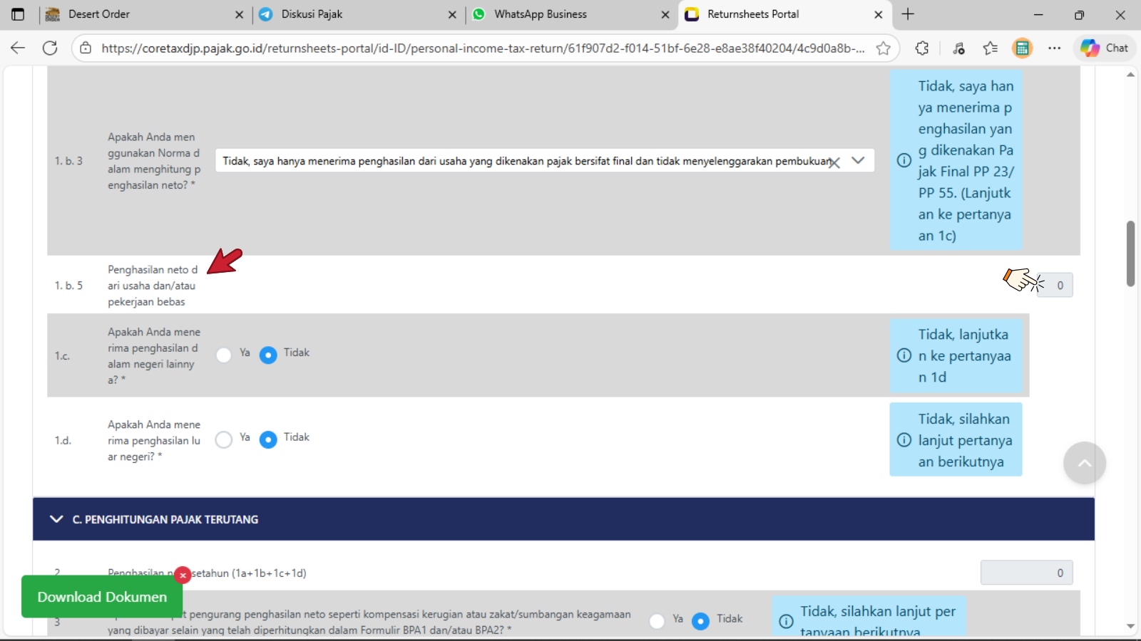 Perhatikan notifikasi pada sisi kanan di baris nomor 1.b.3, bunyinya : Tidak, saya hanya menerima penghasilan yang dikenakan Pajak Final PP 23/PP 55. (Lanjutkan ke pertanyaan 1c).