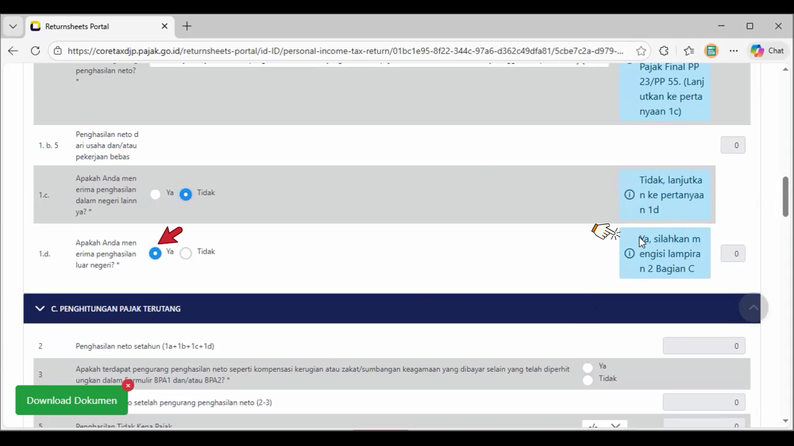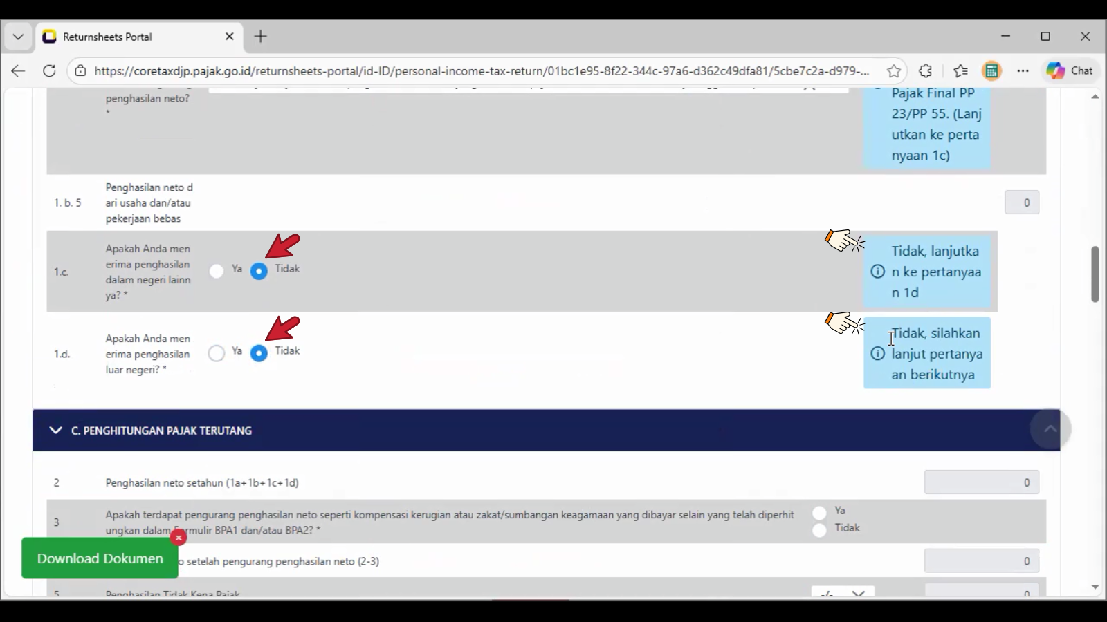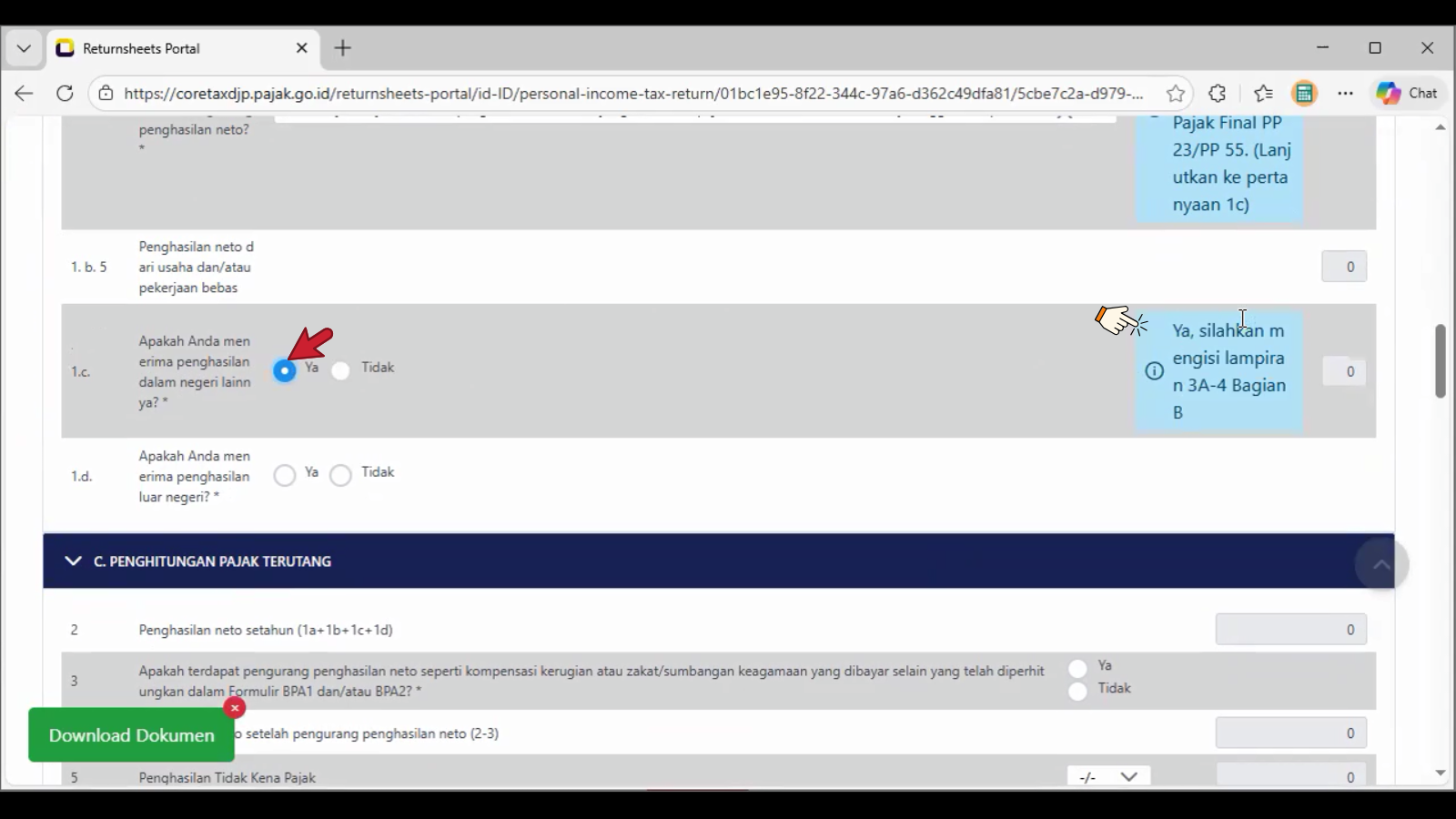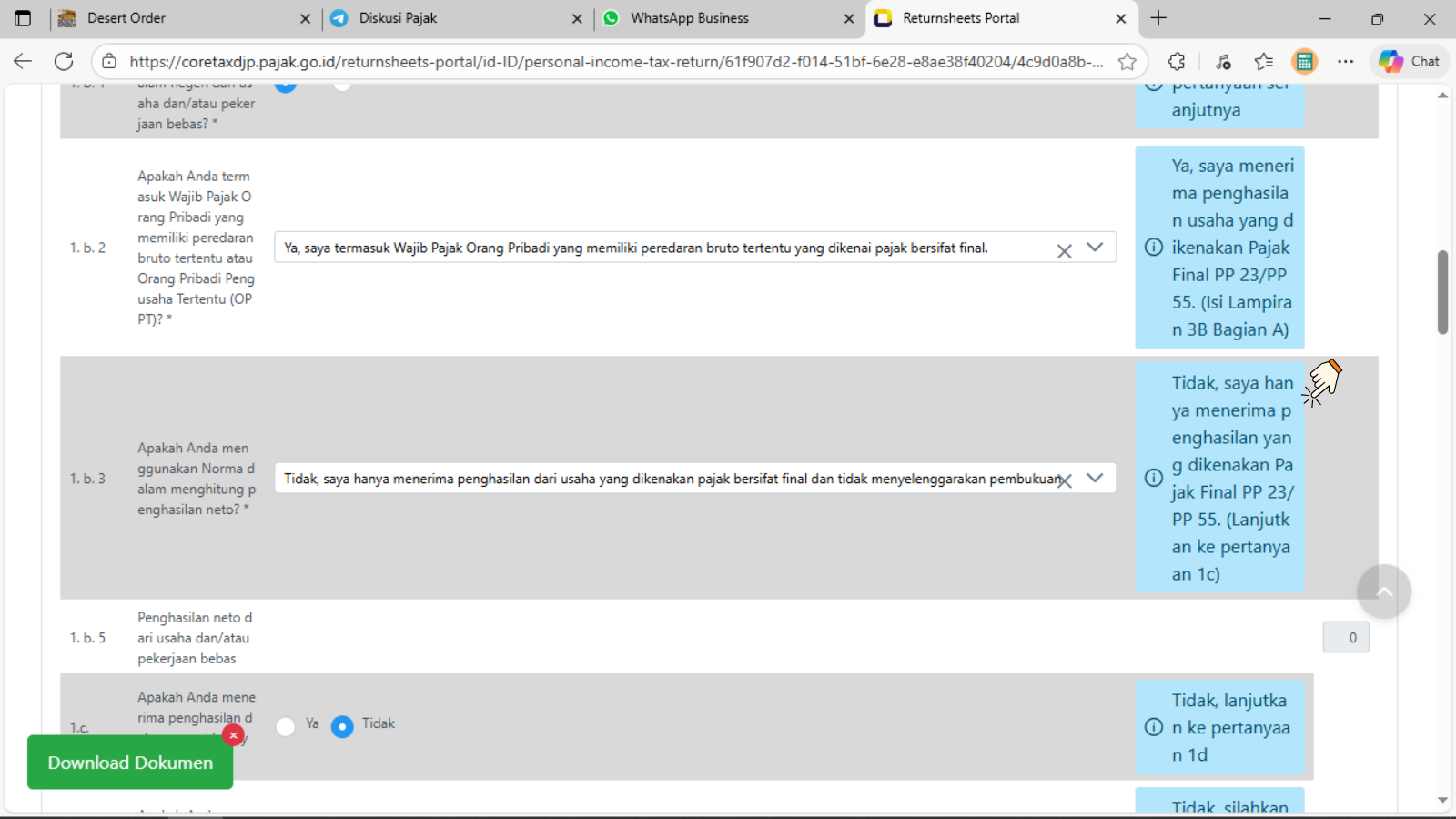 Perhatikan notifikasi pada sisi kanan di baris nomor 1.b.3, bunyinya : Tidak, saya hanya menerima penghasilan yang dikenakan Pajak Final PP 23/PP 55. (Lanjutkan ke pertanyaan 1c).