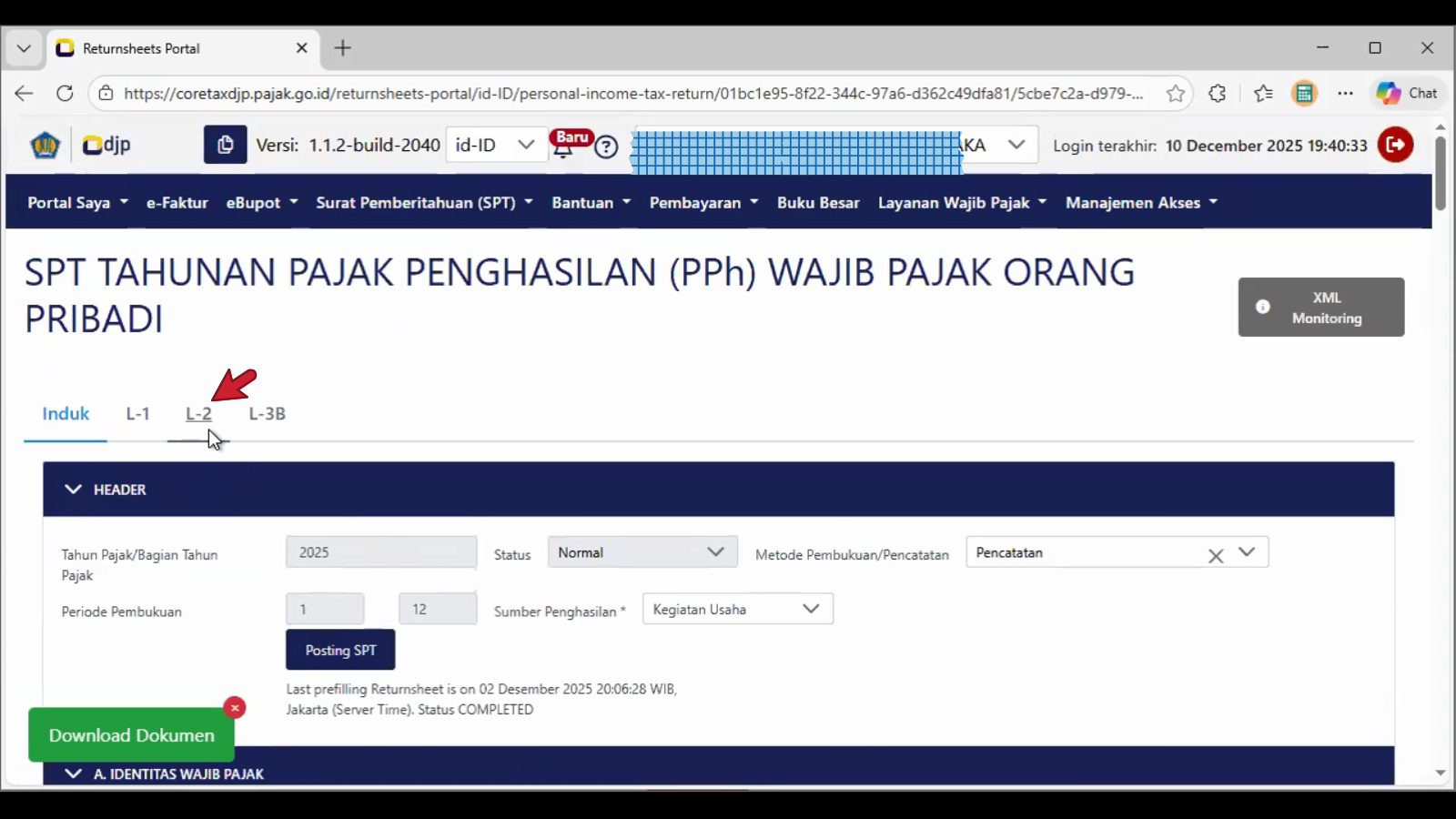 Pilih bulatan jawaban Ya jika menerima penghasilan luar negeri dan mengaktifkan atau terhubung dengan Lampiran 2 Bagian C seperti pada notifikasi pada sisi kanan bagan (tampilan pada header spt tahunan yang menampilkan aktif L-2 pada gambar di bawah ini).