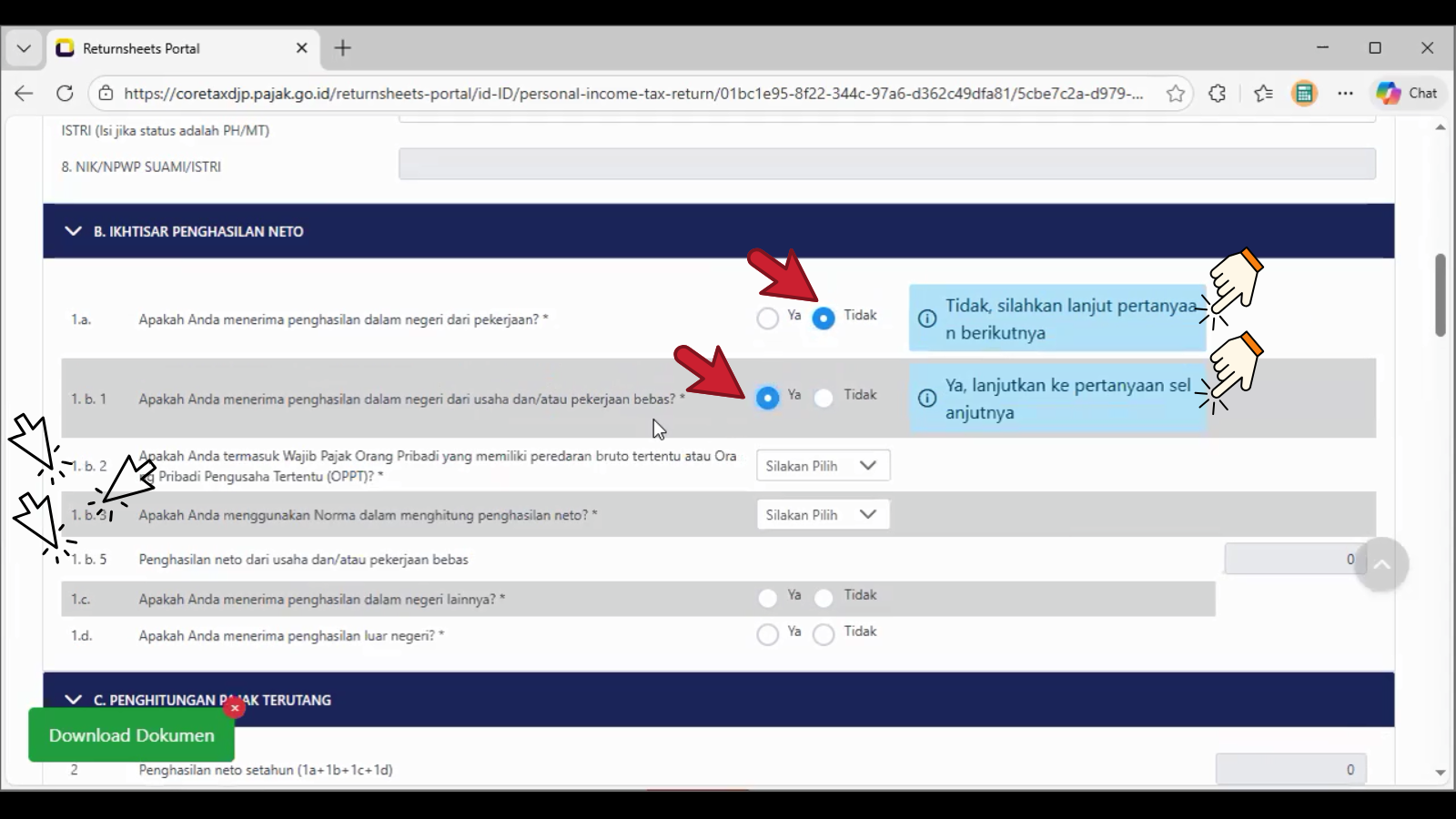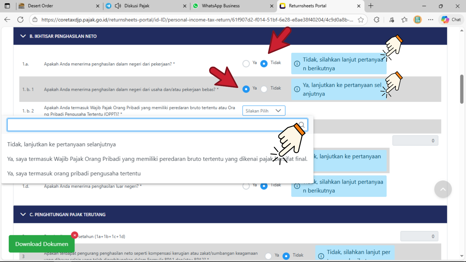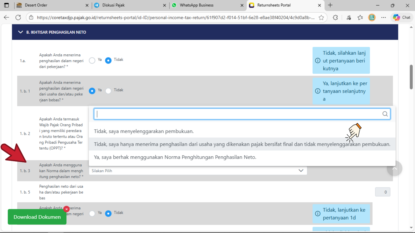 1.b.1. Apakah Anda menerima penghasilan dalam negeri dari usaha dan/atau pekerjaan bebas? * (Pilih jawaban Ya dengan cara klik pada bulatan)