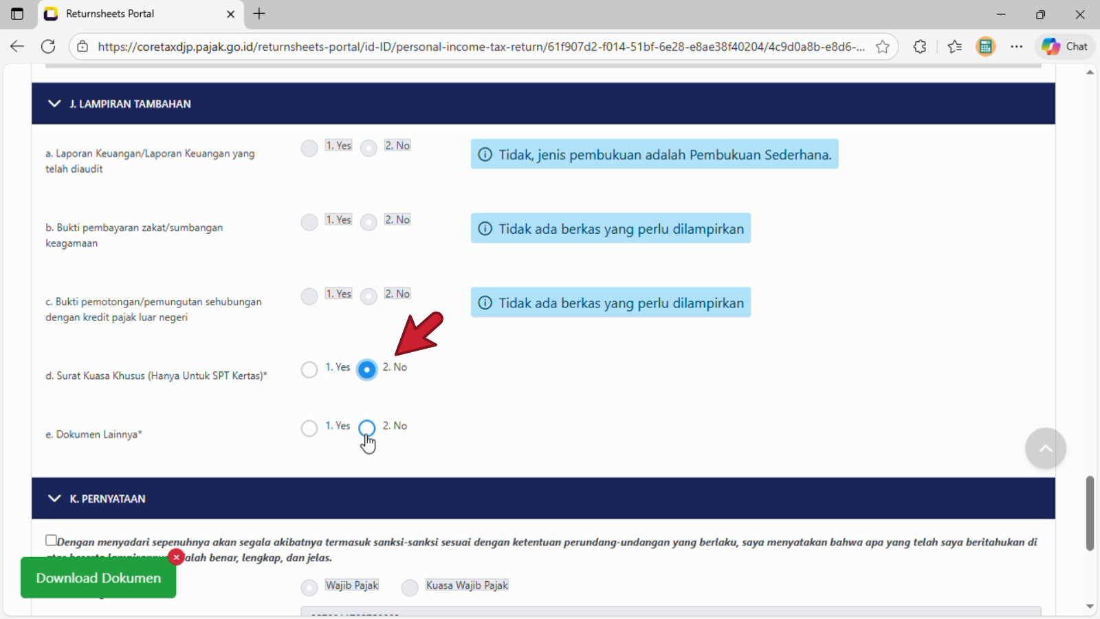(sesuai pilihan bulatan jawaban Tidak pada bagan B. Ikhtisar Penghasilan Neto - nomor 1d.). - Huruf d. Surat Kuasa Khusus (hanya untuk SPT Kertas) *