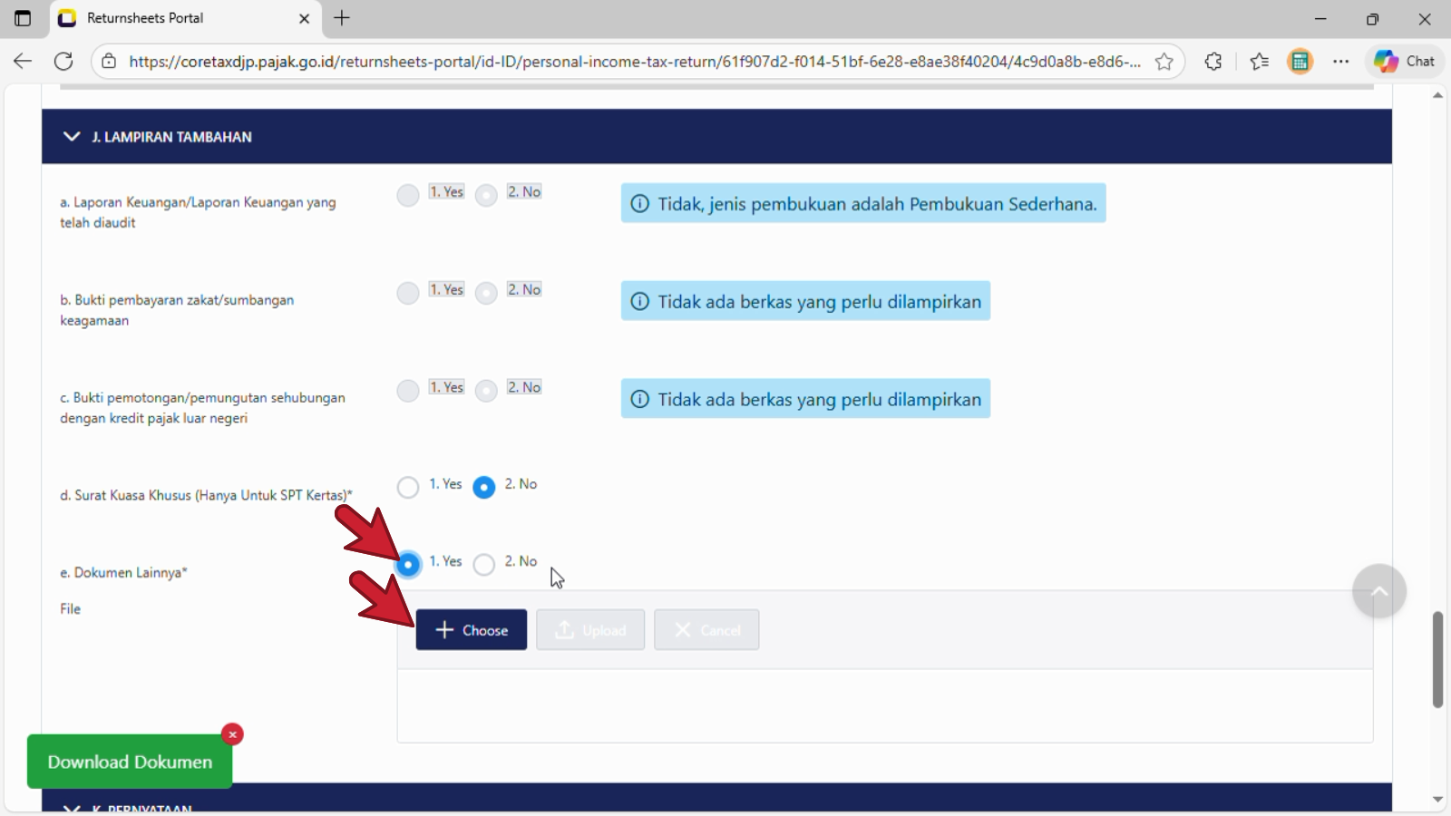 Pilih bulatan jawaban Yes, selanjutnya klik tombol + Choose untuk uplaod atau sisipkan file berformat pdf berupa Tabel Peredaran Bruto.