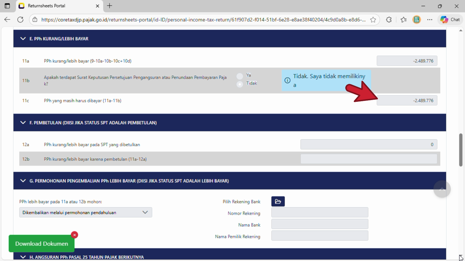 Kondisi tangkapan layar contoh di atas nomor 11c. PPh yang masih harus dibayar (11a-11b) adalah - Rp. 2.489.776