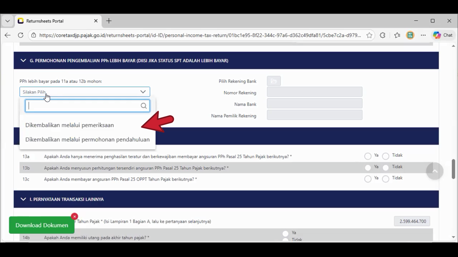 Kondisi tertentu jika lebih bayar pada spt tahunan PPh wp op dengan besaran di bawah batasan Rp. 1.000.000.000,- (satu milyard Rupiah), maka pilih dengan fasilitas Dikembalikan melalui permohonan pendahuluan.