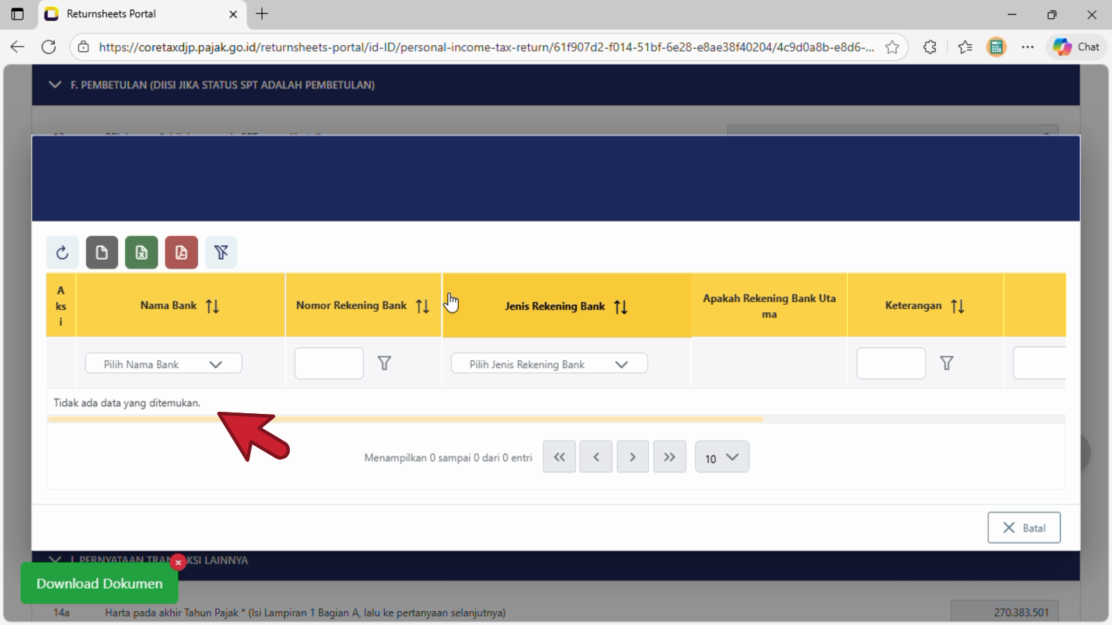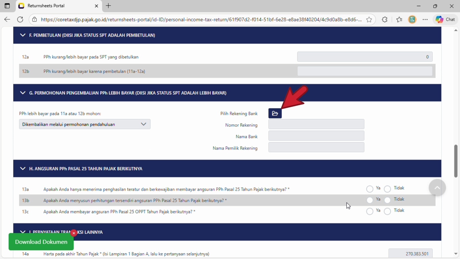 Setelah memilih dengan Dikembalikan melalui permohonan pendahuluan, klik atau pilih pada baris Pilih Rekening Bank —> icon/lambang folder/map.