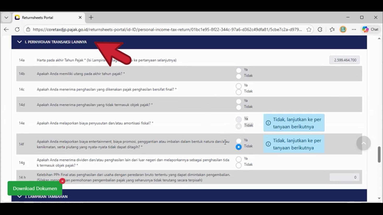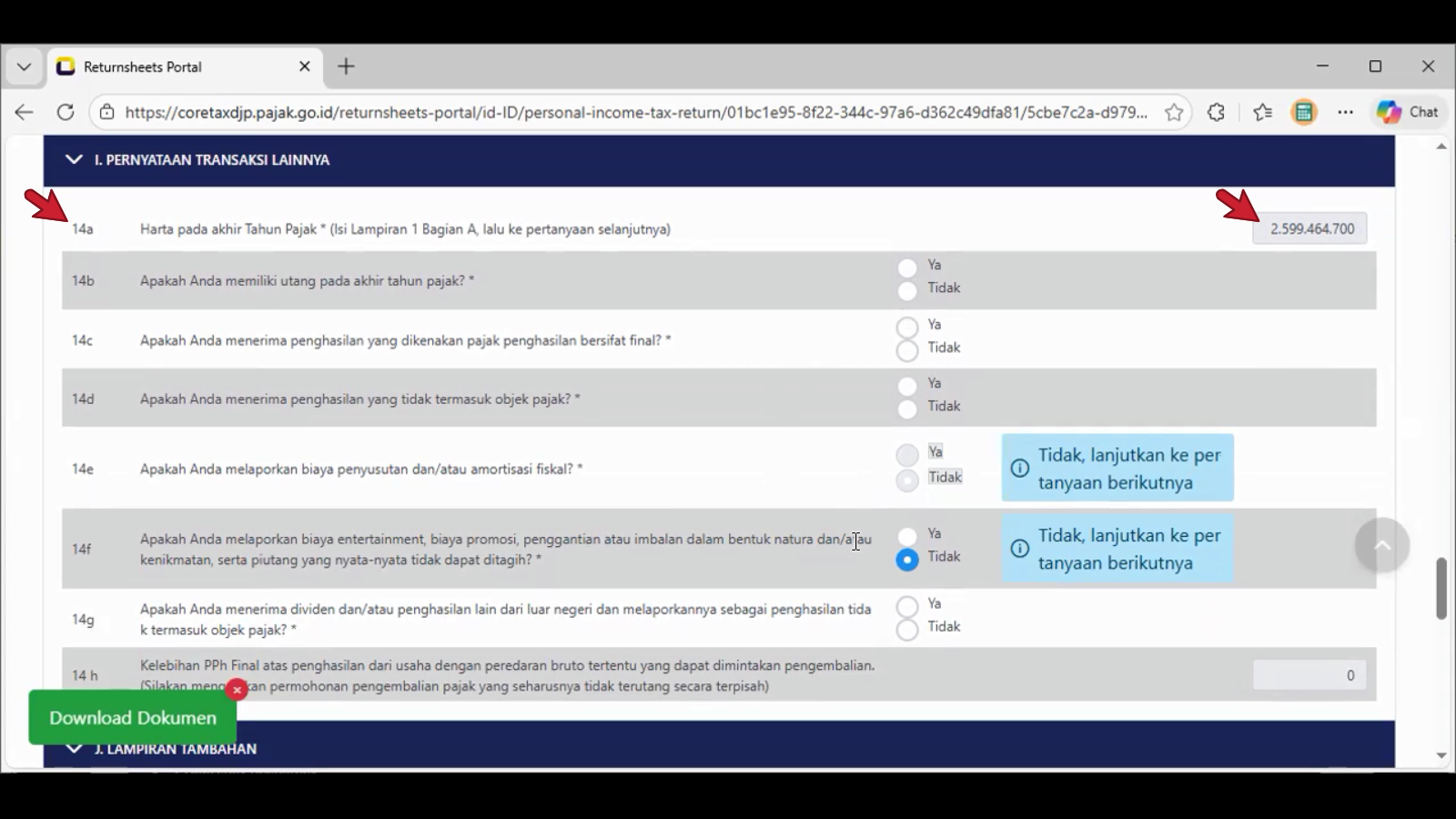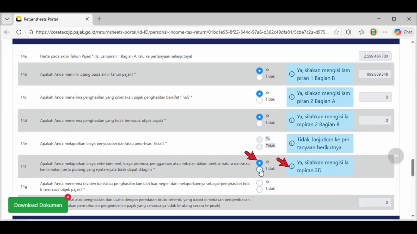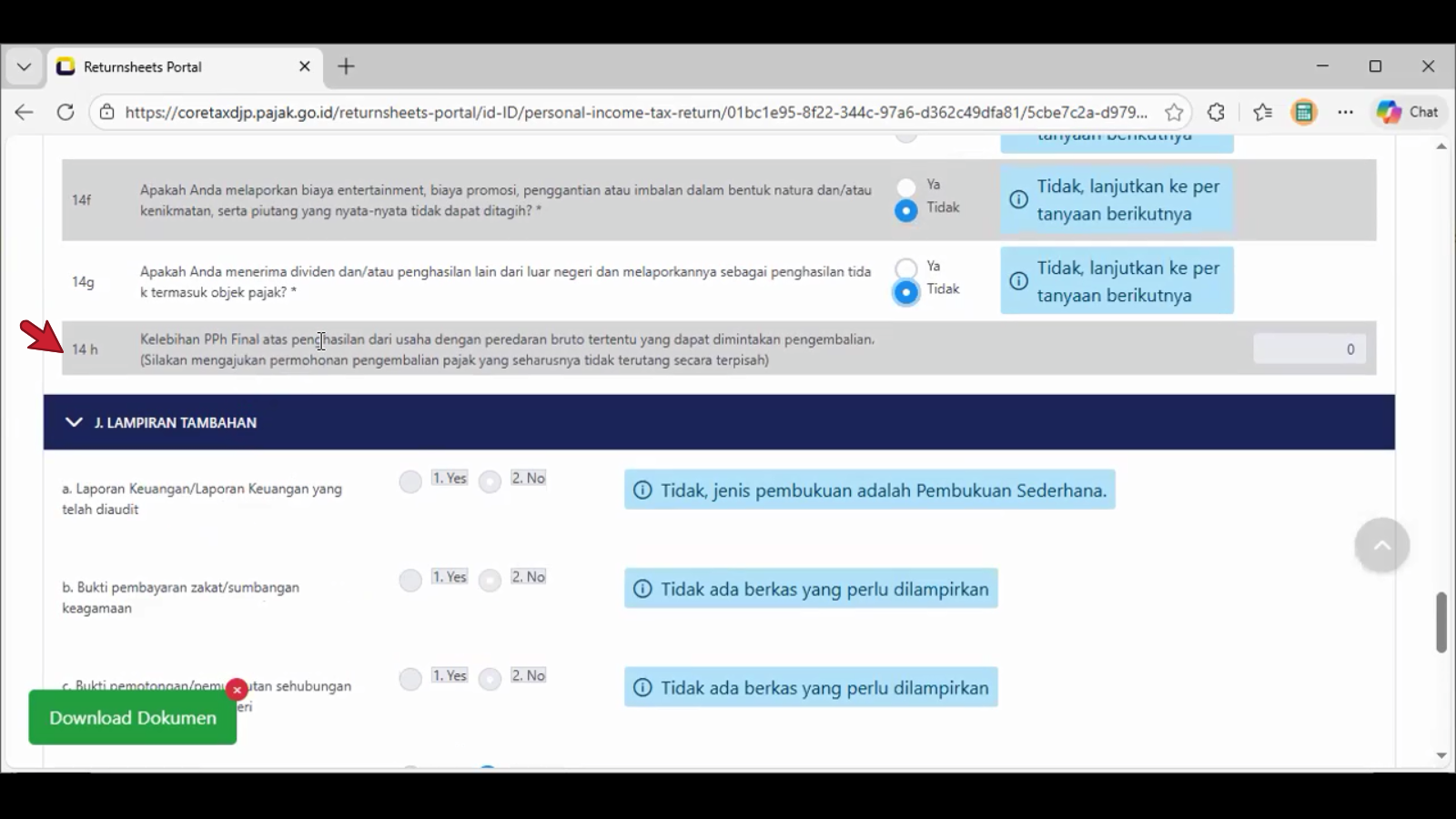 Contoh tangkapan layar pada pilihan jawaban bulatan Ya di nomor 14c. , tampil pada header spt adalah L-2.