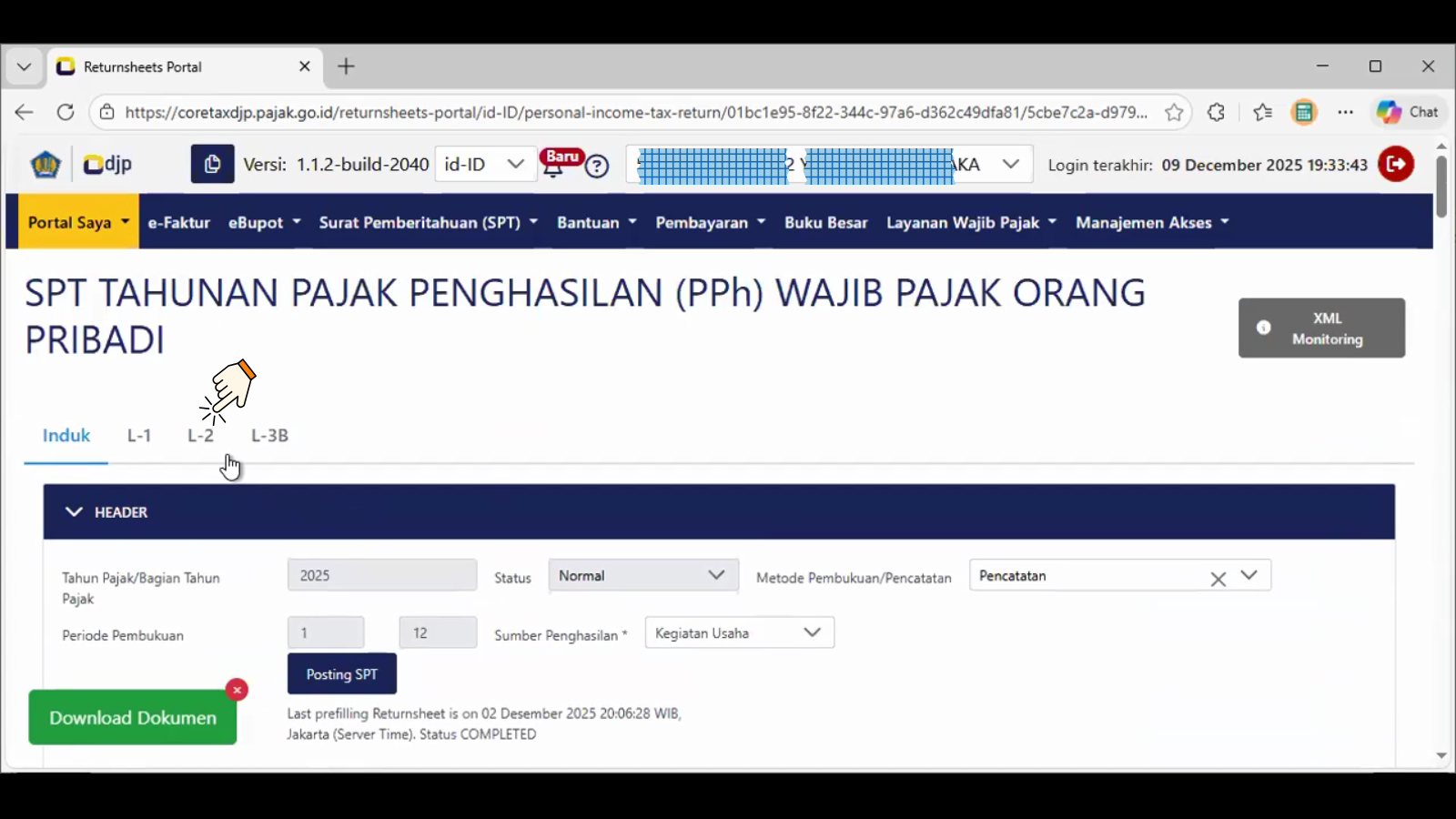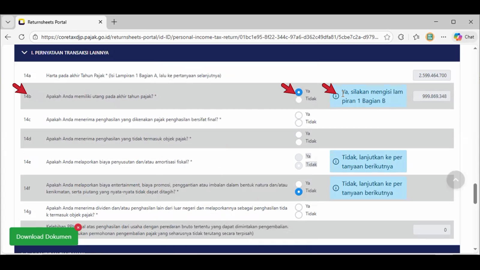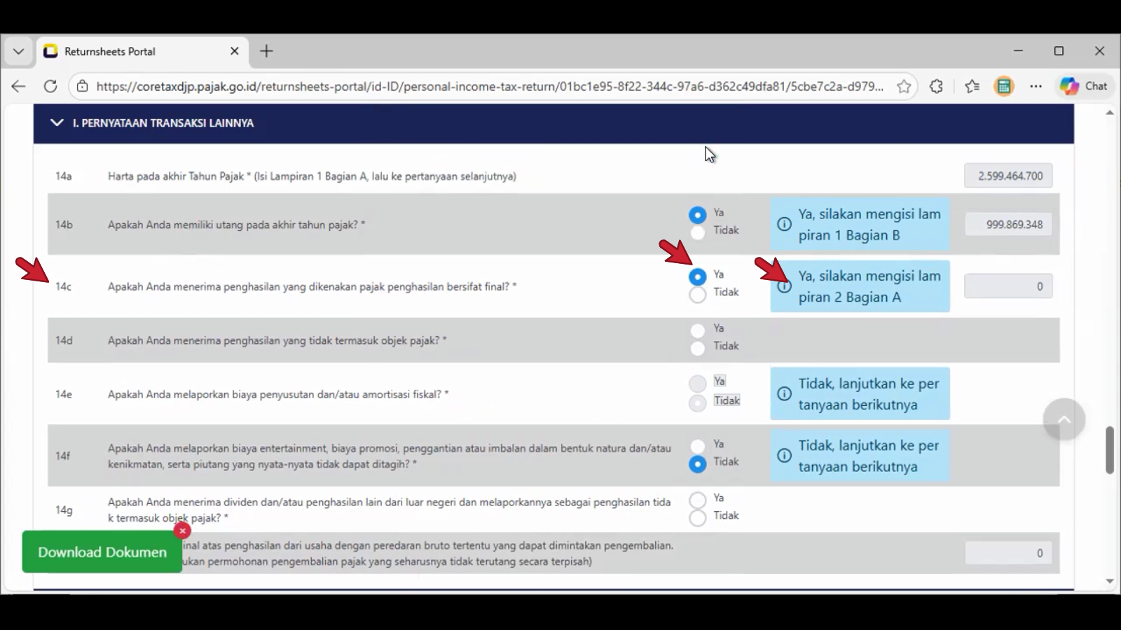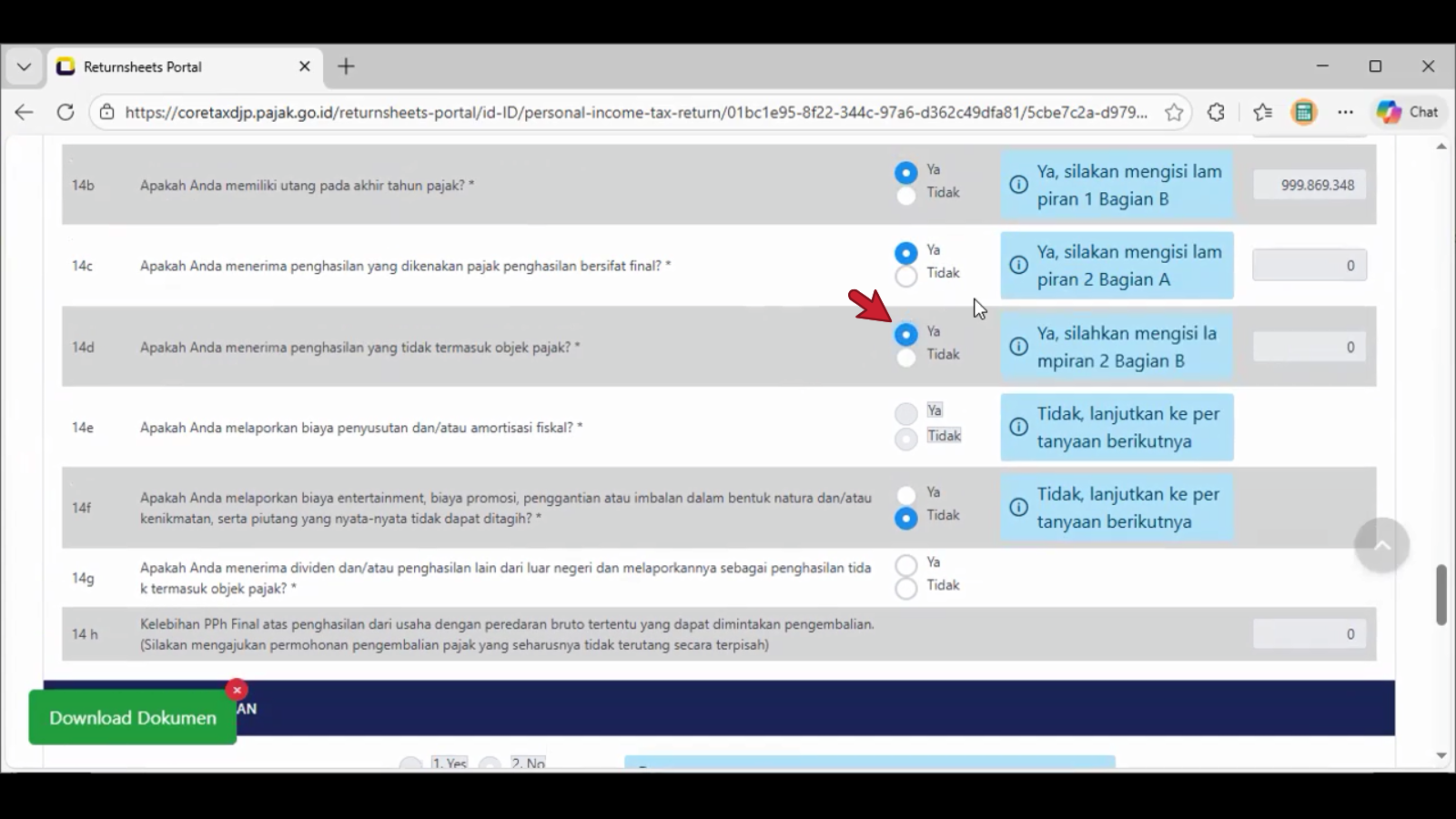 Contoh tangkapan layar pada pilihan jawaban bulatan Ya di nomor 14c. , tampil pada header spt adalah L-2.