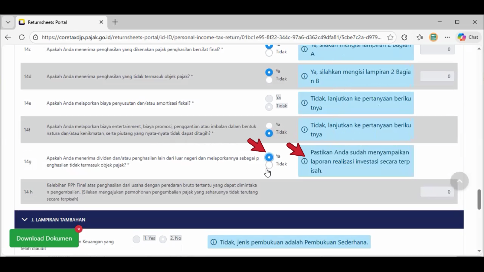 Pada contoh tangkapan layar di atas adalah memilih dengan bulatan jawaban Ya dengan notifikasi pada sisi kanan adalah: Ya, silahkan mengisi lampiran 2 Bagian A.