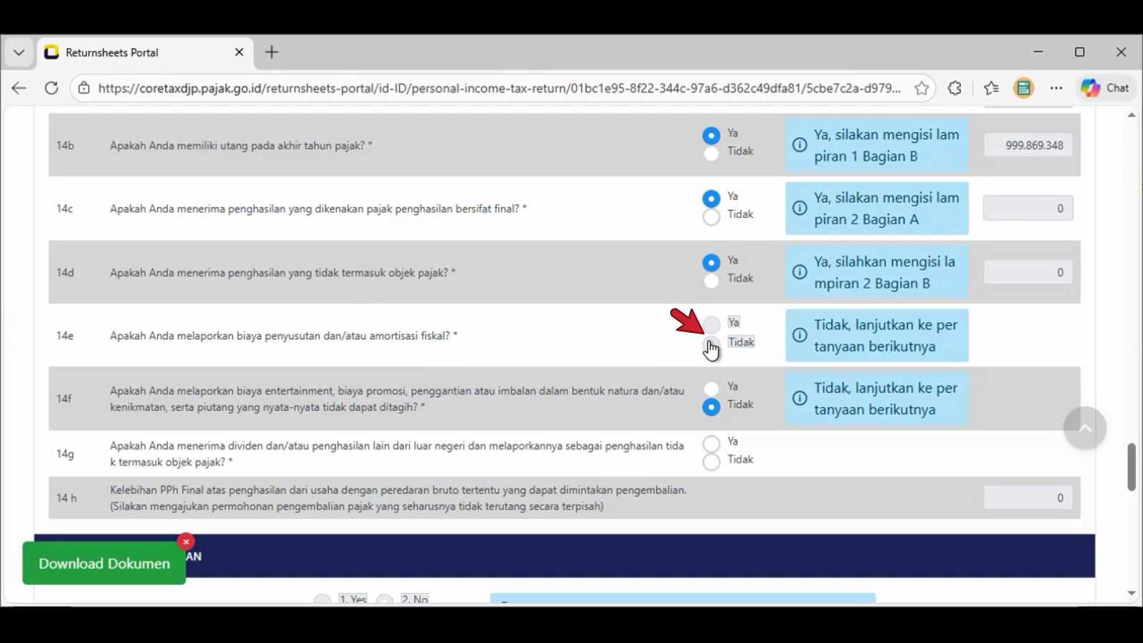 Nomor 14e. Apakah anda melaporkan biaya penyusutan dan/atau amortisasi fiskal? *