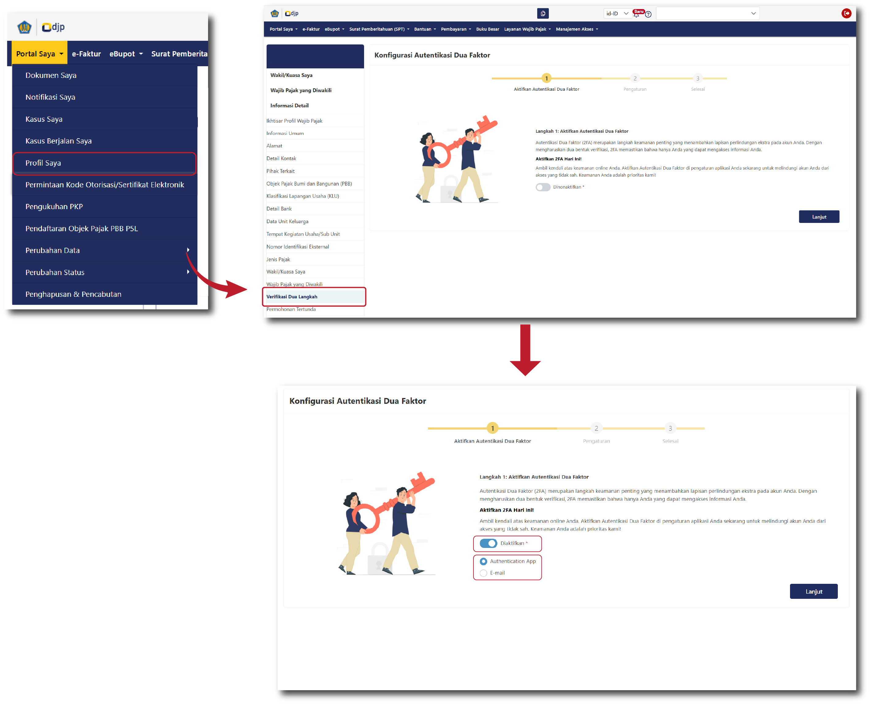 - Pada menu Portal Saya > Profil Saya cek panel di sebelah kiri layar, kemudian pilih Verifikasi Dua Langkah.