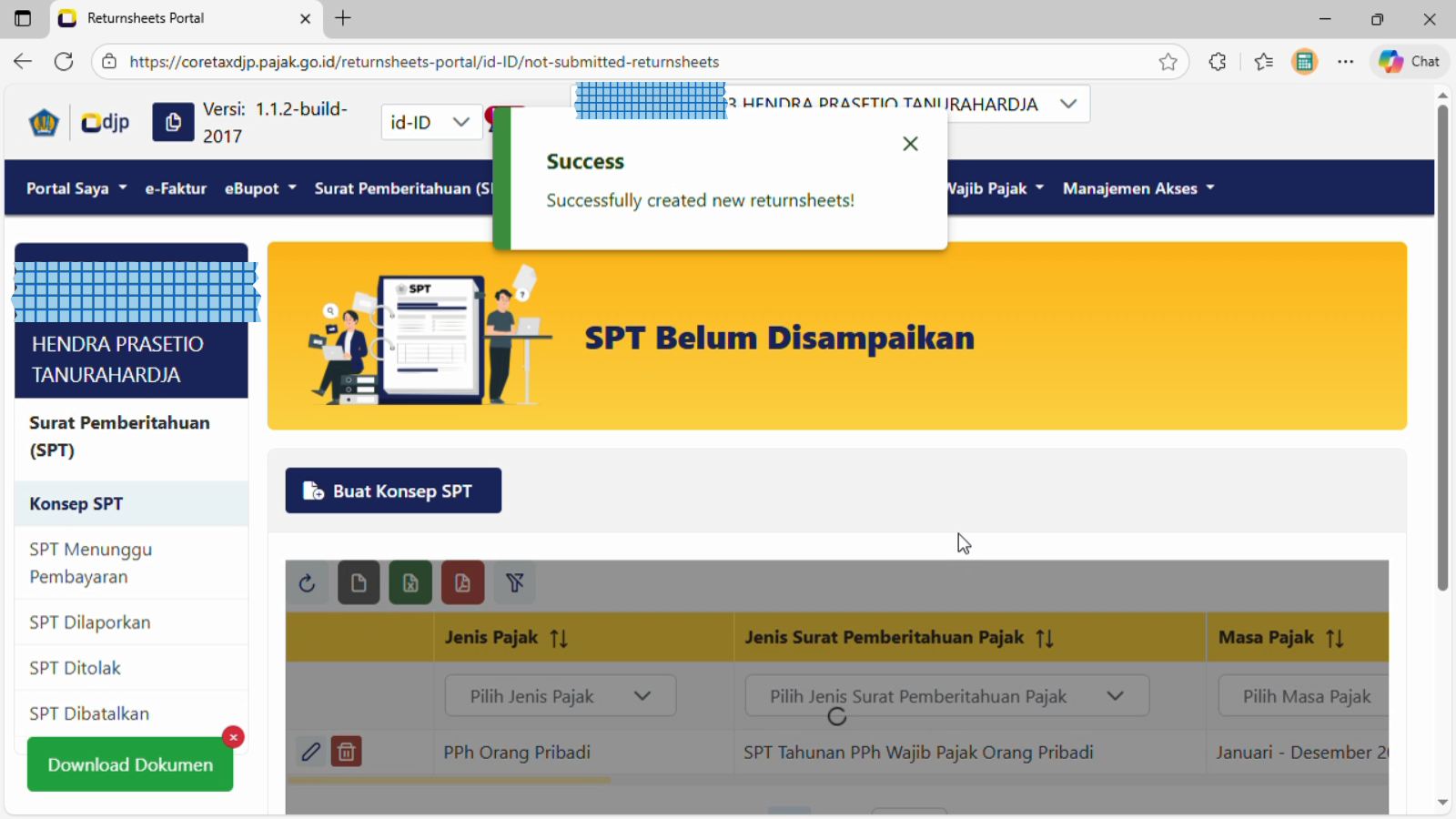 Langkah 10: - Tampil notifikasi Success - Succesfully created new returnsheet! - Perhatikan pada tabel adalah telah tampil SPT Tahunan PPh Wajib Pajak Orang Pribadi