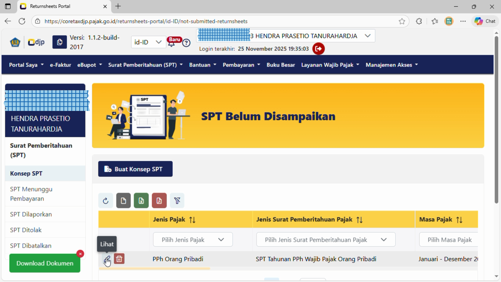 Langkah 11: - Klik icon pencil untuk lihat SPT Tahunan PPh Wajib Pajak Orang Pribadi