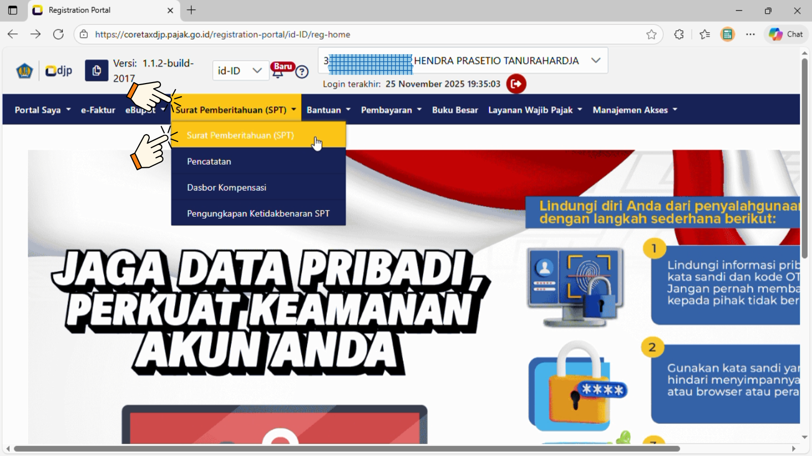 Langkah 1: - Akses laman portal core tax - Isi kolom ID Pengguna - Isi kolom Kata Sandi - Pilih id-ID pada kolom Pemilihan Bahasa - Ketikkan Captch - Klik tombol Login dengan perangkat mouse komputer