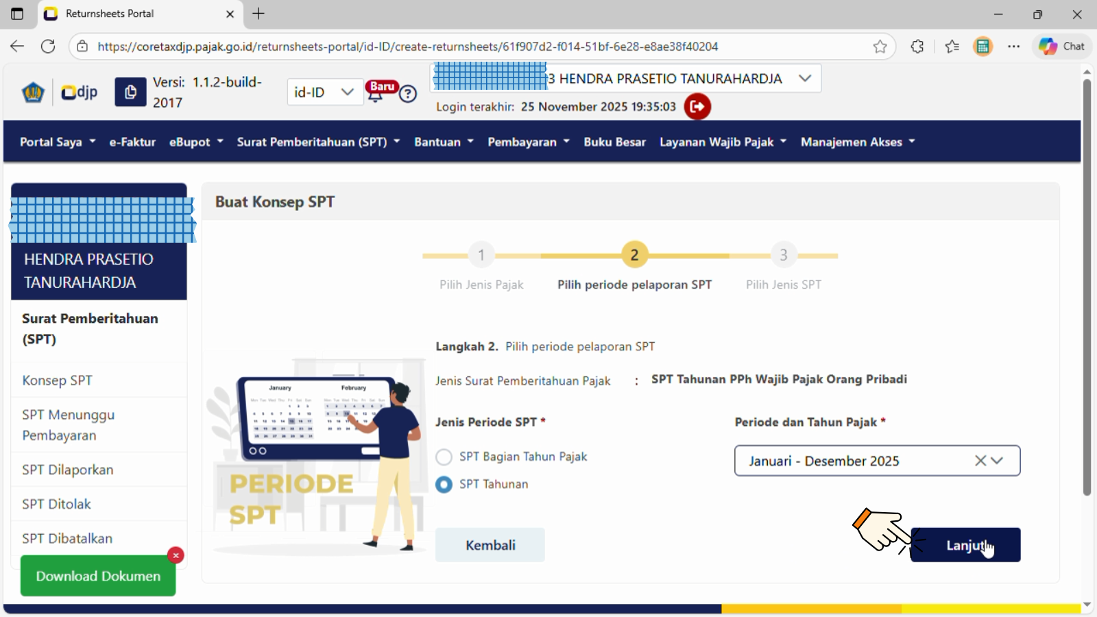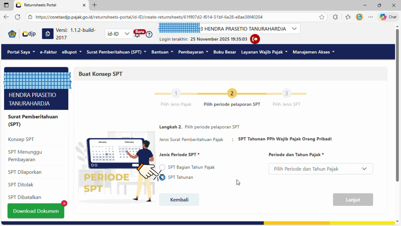 Langkah 6: - Pilih atau klik pada bagan Periode dan Tahun Pajak untuk memilih Periode dan Tahun Pajak, pilih Januari - Desember 2025