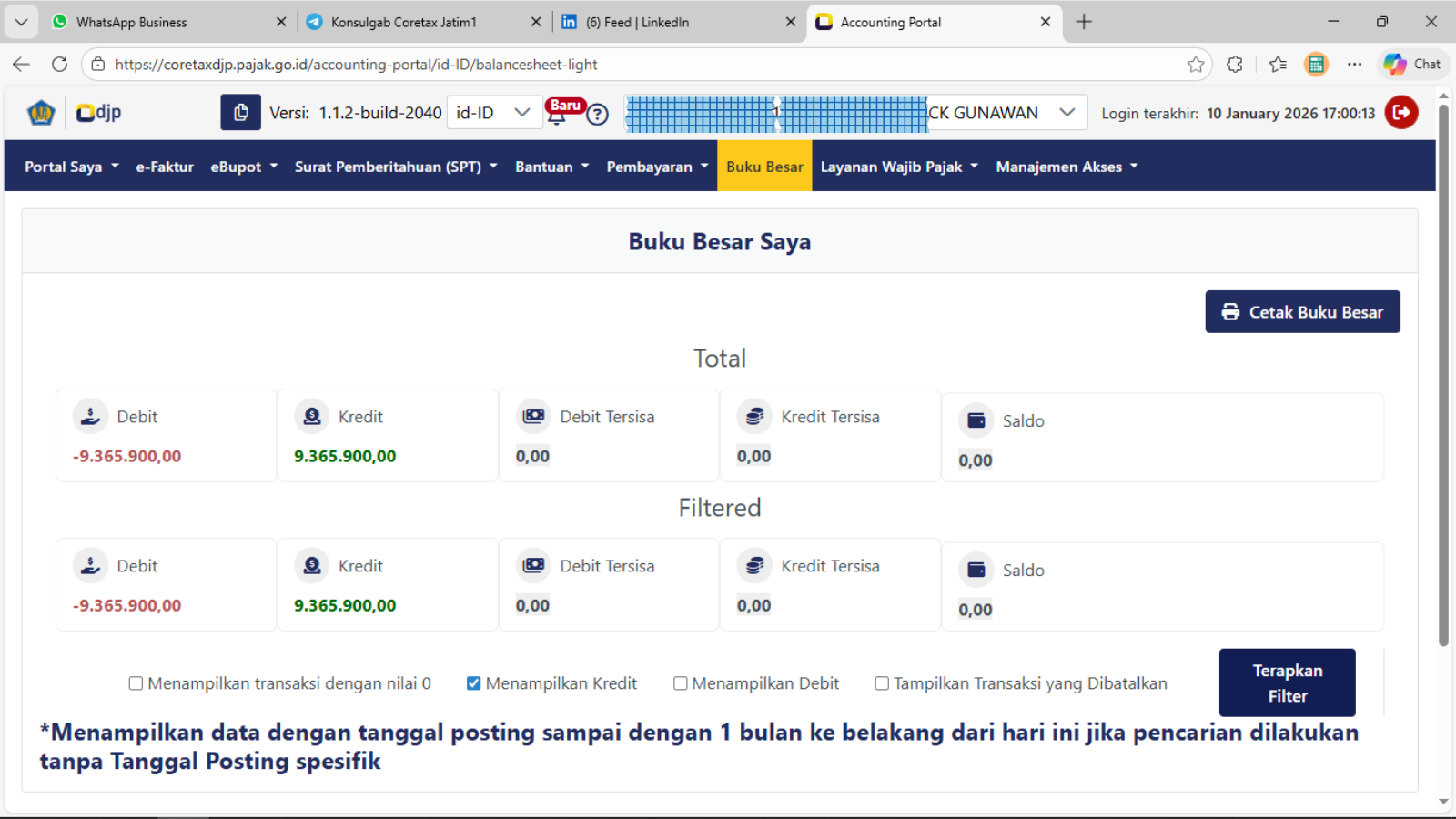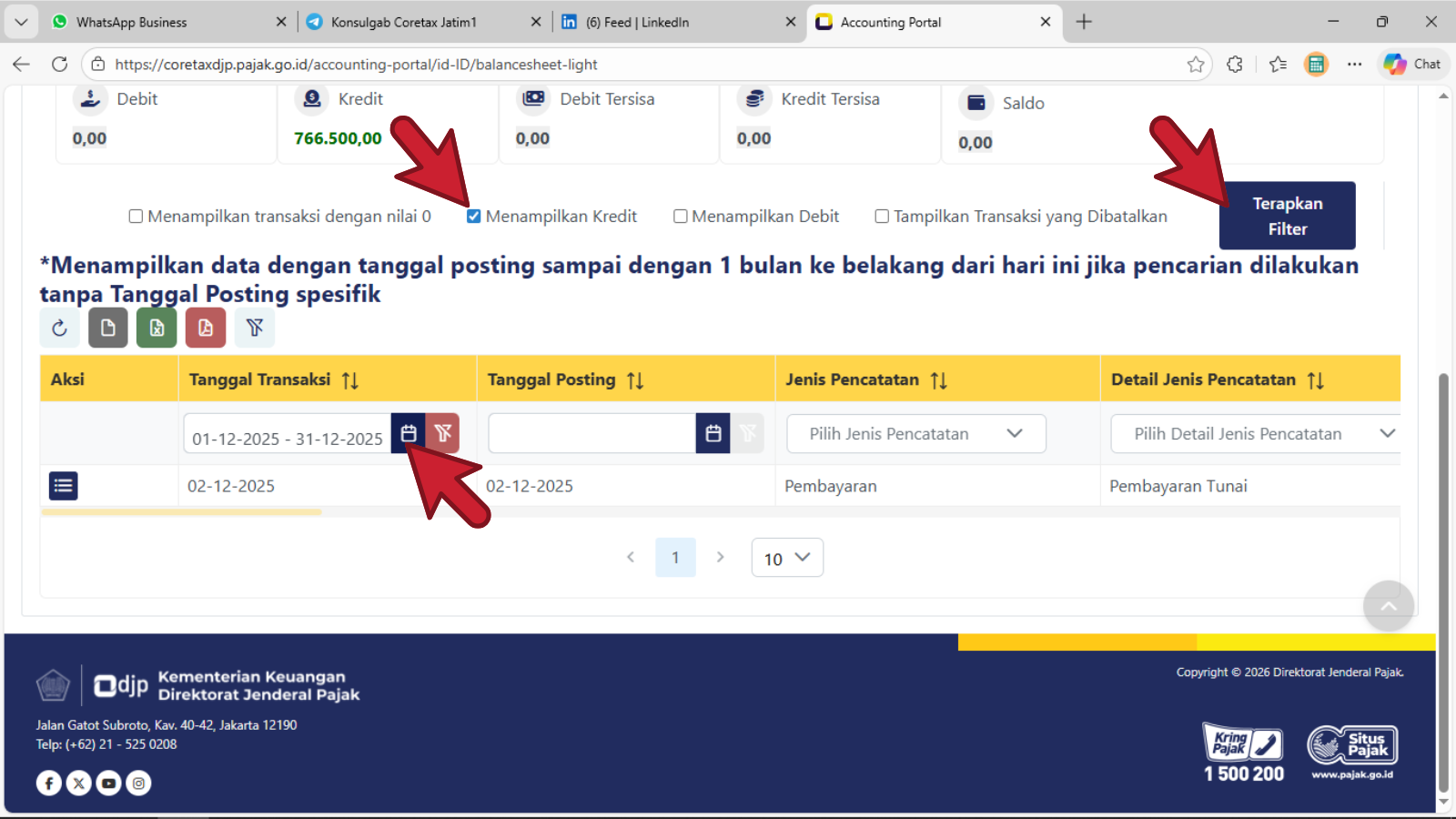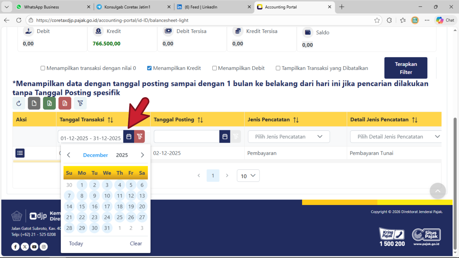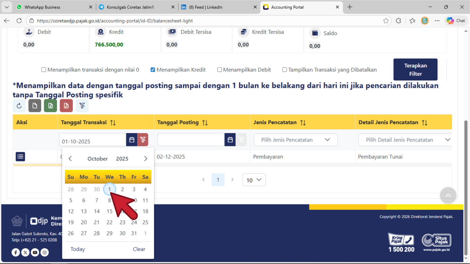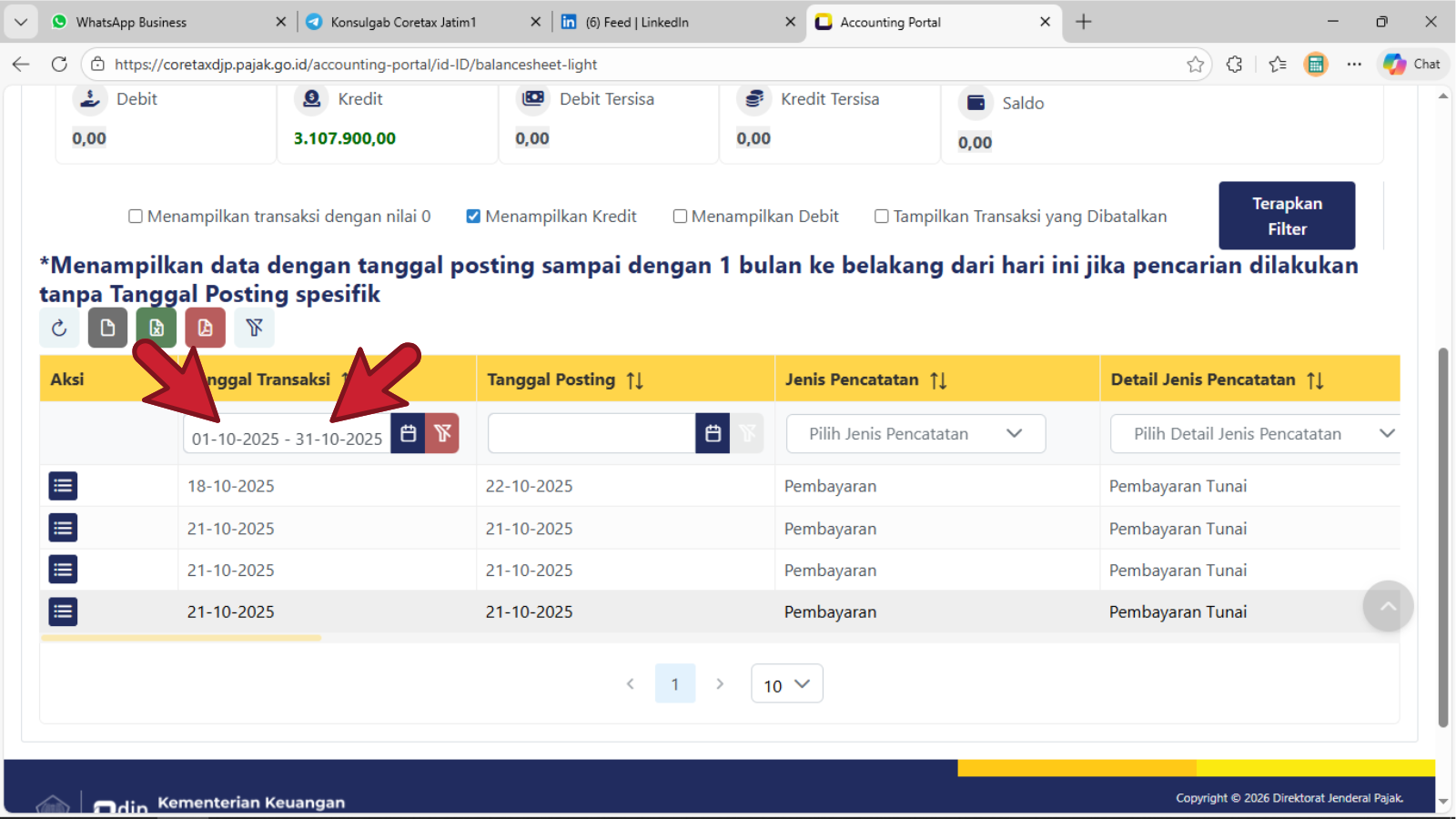 - Klik pada sembarang tempat, maka rentang Tanggal Transaksi akan tampil dengan angka : 01-10-2025 - 31-10-2025 seperti contoh di atas dan sistem akan menampilkan arus transaksi Kredit yang dilakukan wajib pajak (silahkan geser ke arah kanan laman untuk keterangan transaksi lebih lanjut).