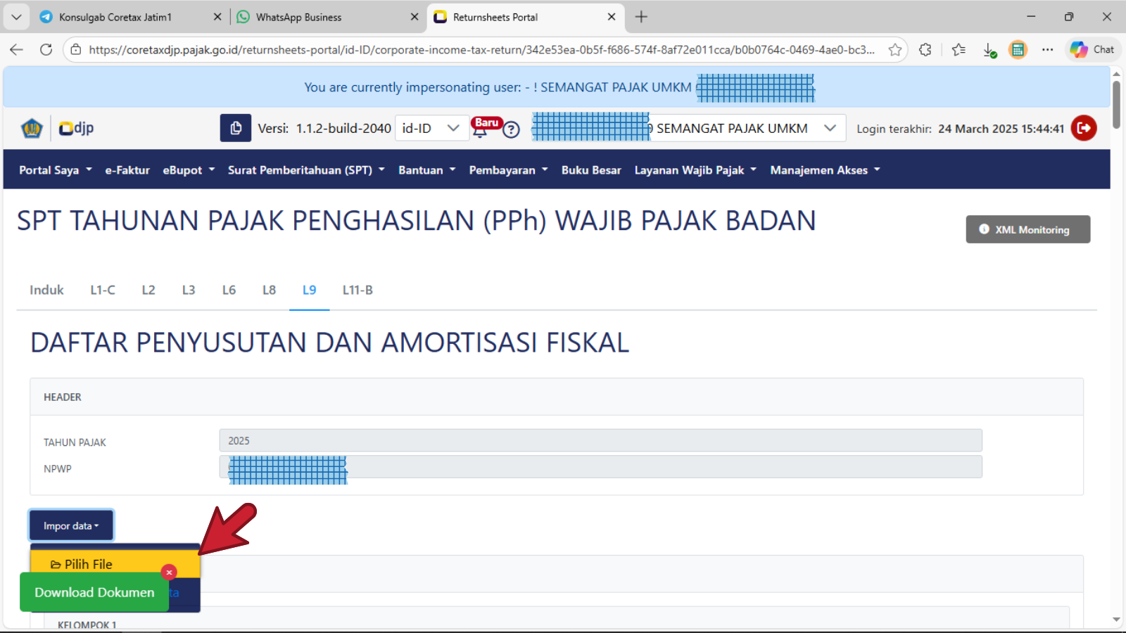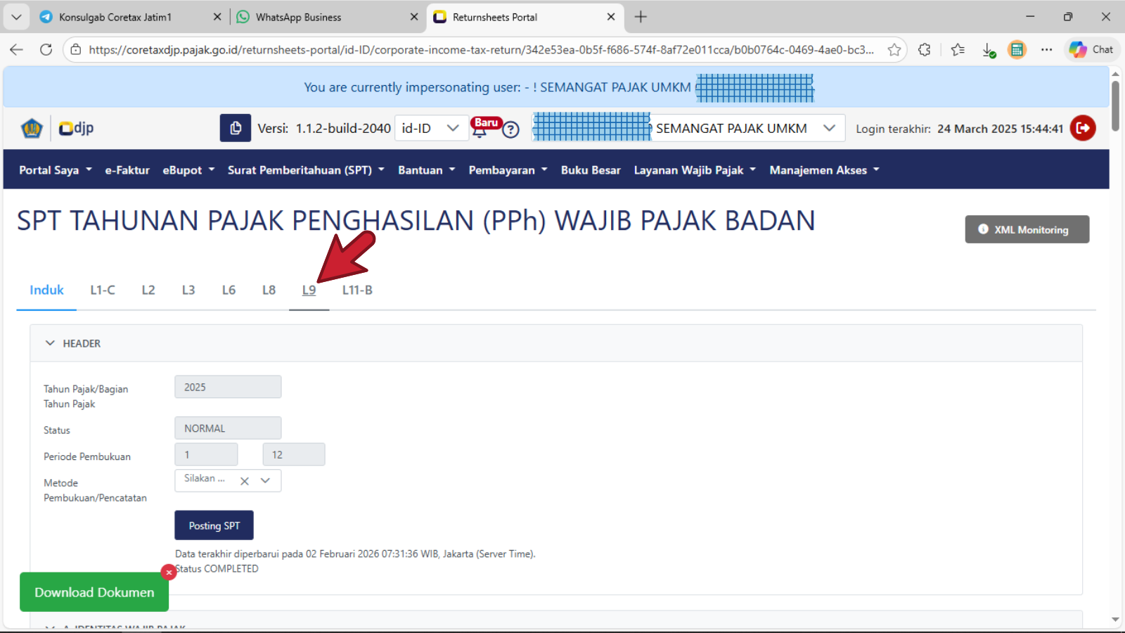 - Buka kembali laman portal core tax pada konsep spt tahunan pajak penghasilan (PPh) wajib pajak badan, klik pada L9 (Lampiran 9) ;