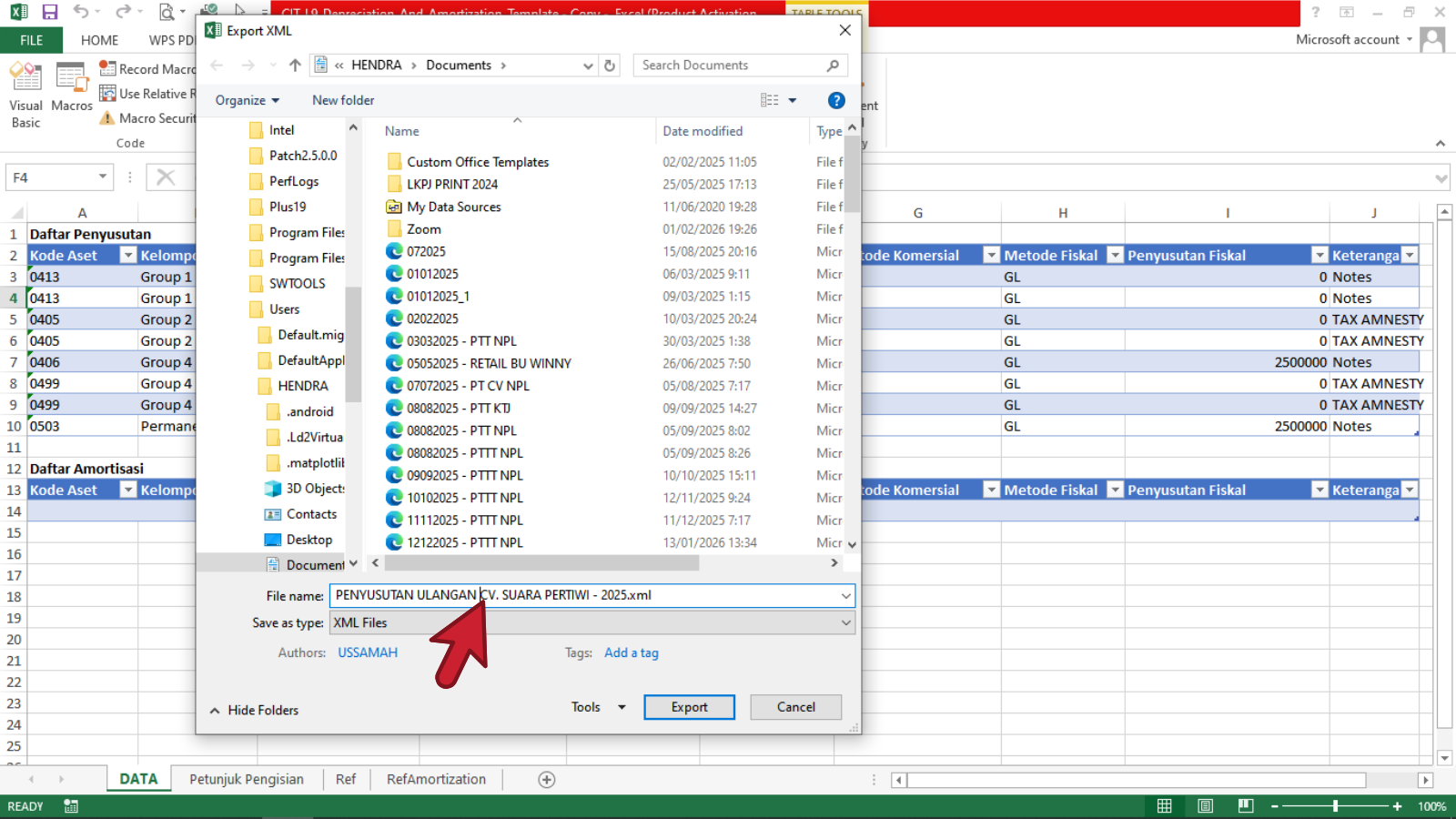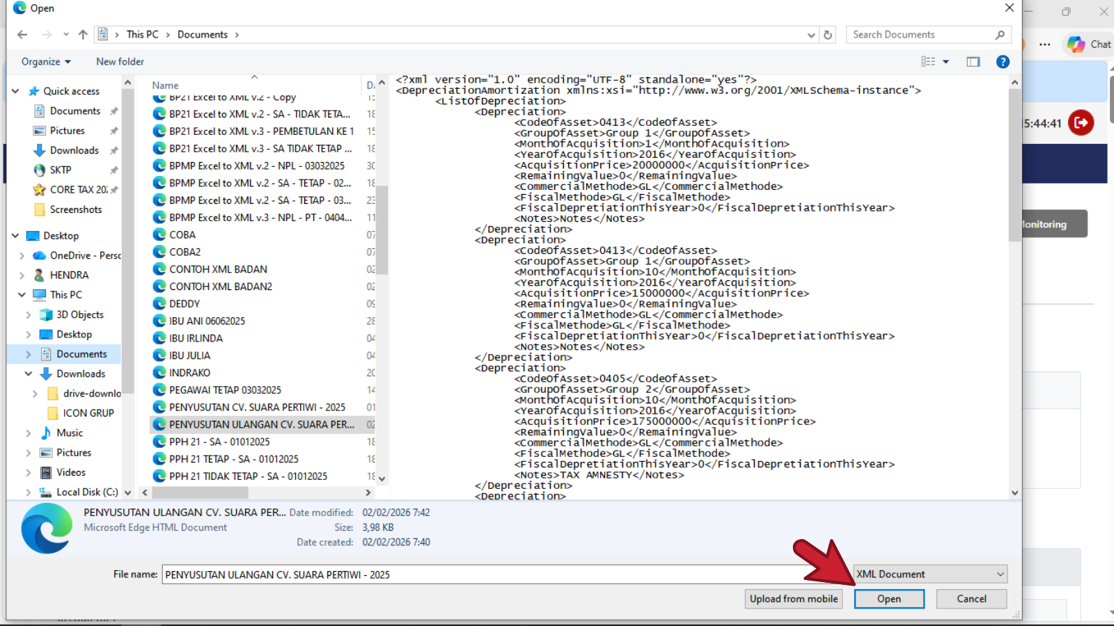 - Pastikan file data penyusutan XML yang telah di rubah/edit dan Klik tombol Open ;