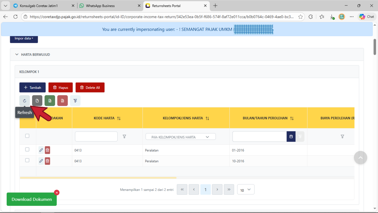 - Tampil 2 data kode harta baru yang merupakan data tambahan dari proses import XML dan menjadi 4 kode harta, begitu pula selanjutnya pada tabel Kelompok 2, Kelompok 3, Kelompok 4 dan Kelompok BANGUNAN ;