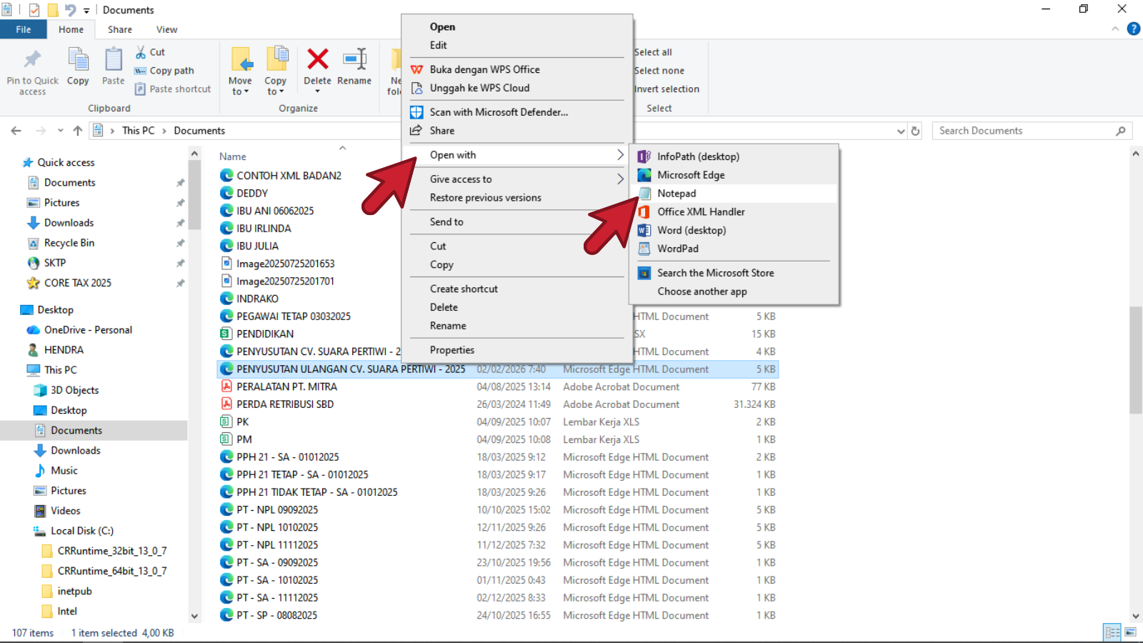 - Setelah di beri judul file, klik kanan mouse perangkat untuk memilih fitur Open with, pilih Notepad ;