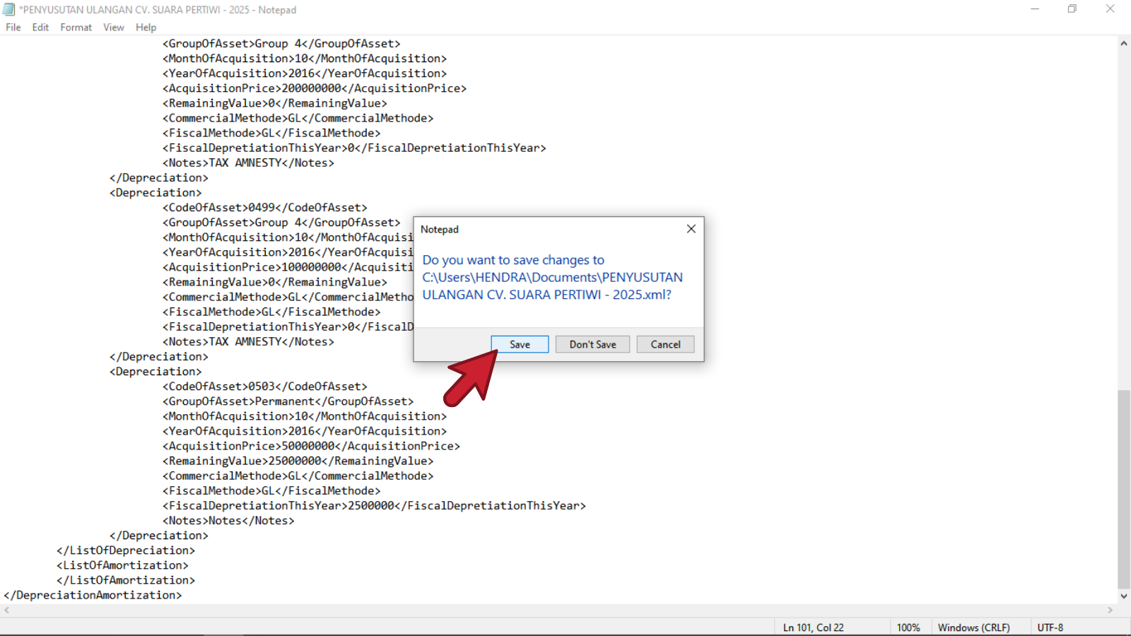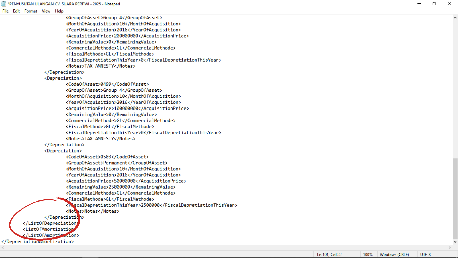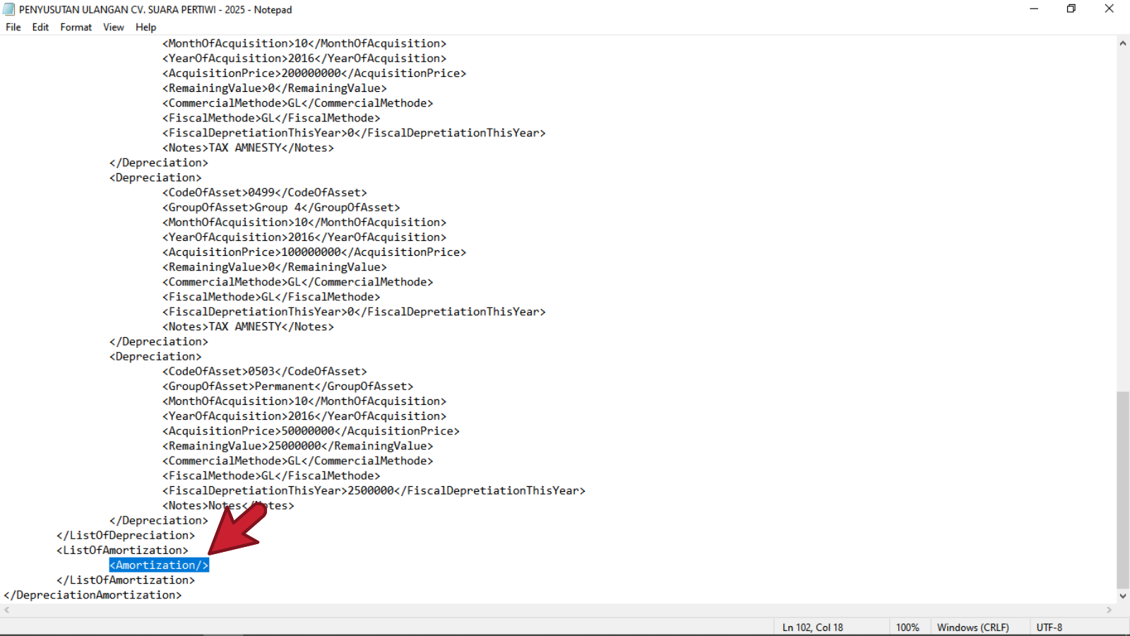 - Pada baris paling bawah, perhatikan dengan uraian terdapat tag <Amortization/> dan dihapus ;