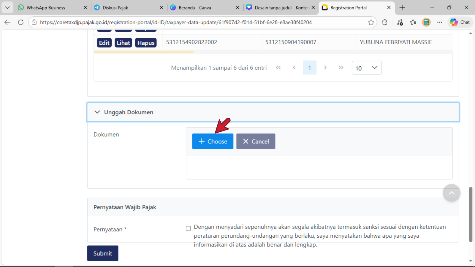 - Selanjutnya adalah bagan Pernyataan Wajib Pajak pada bagian Pernyataan * ;