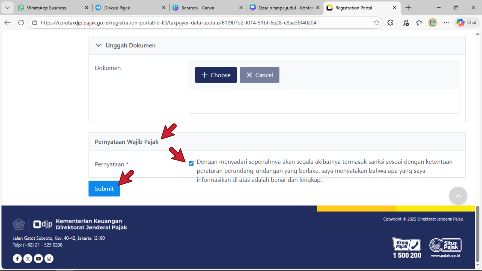 - Centang pada box Pernyataan : Dengan menyadari sepenuhnya akan segala akibatnya termasuk sanksi sesuai dengan ketentuan peraturan perundang-undangan yang berlaku, saya menyatakan bahwa apa yang saya informasikan di atas adalah benar dan lengkap.