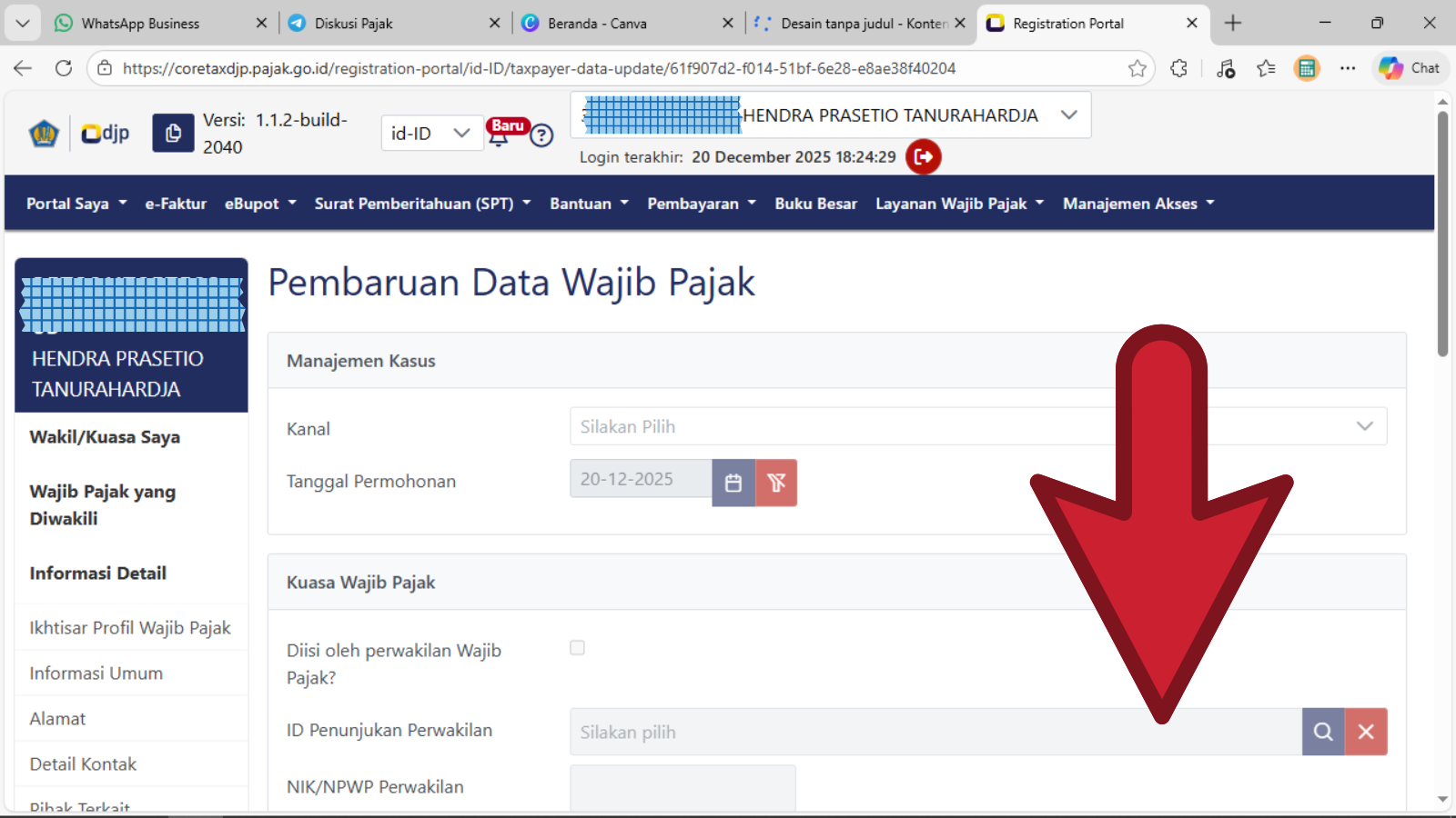 - Tampil laman Pembaruan Data Wajib Pajak seperti tangkapan layar di atas dan dilanjutkan dengan gulir ke bagian bawah laman tersebut.
