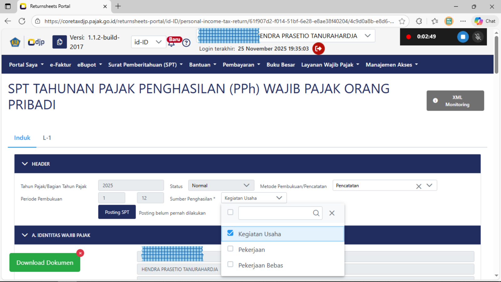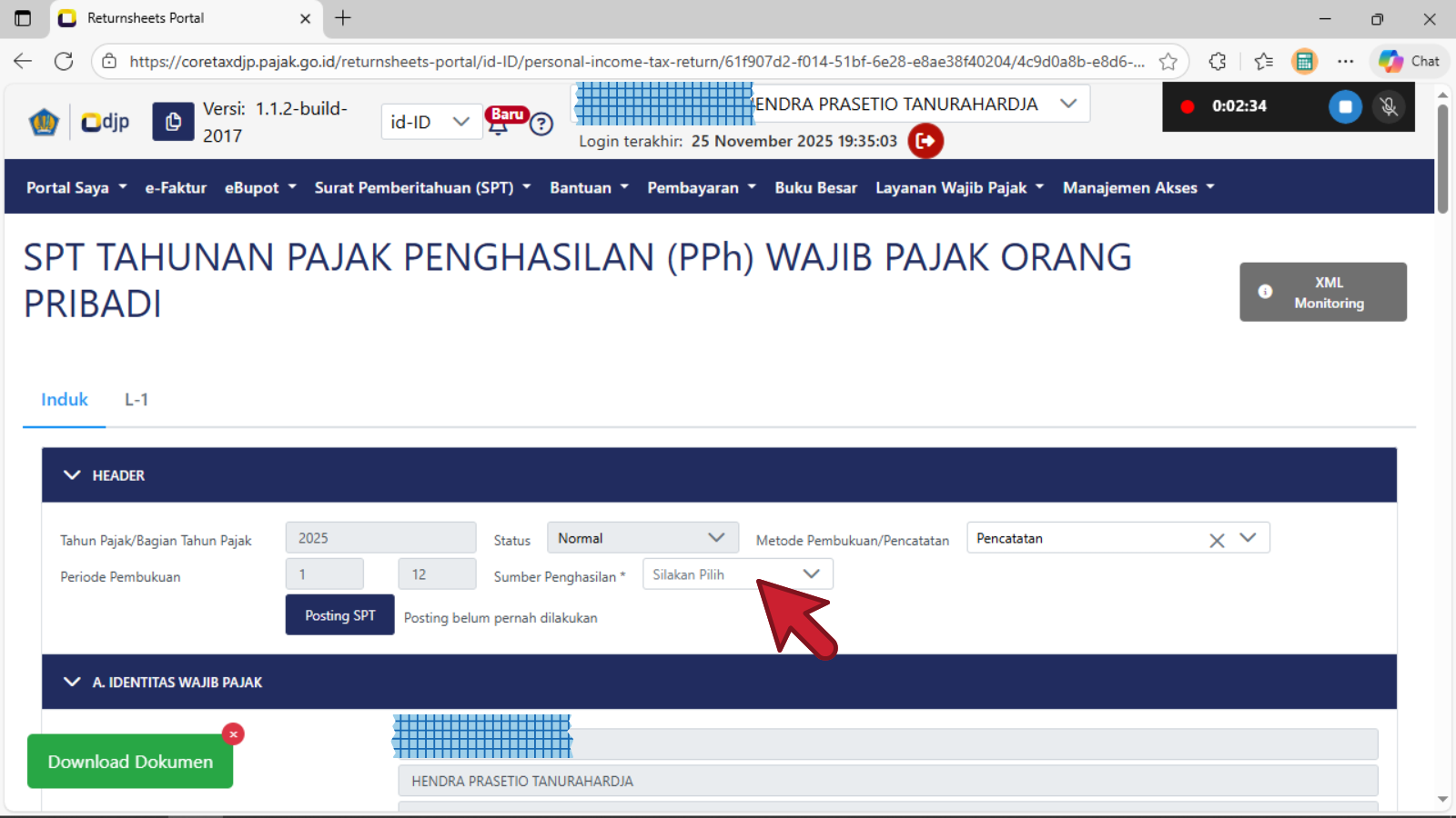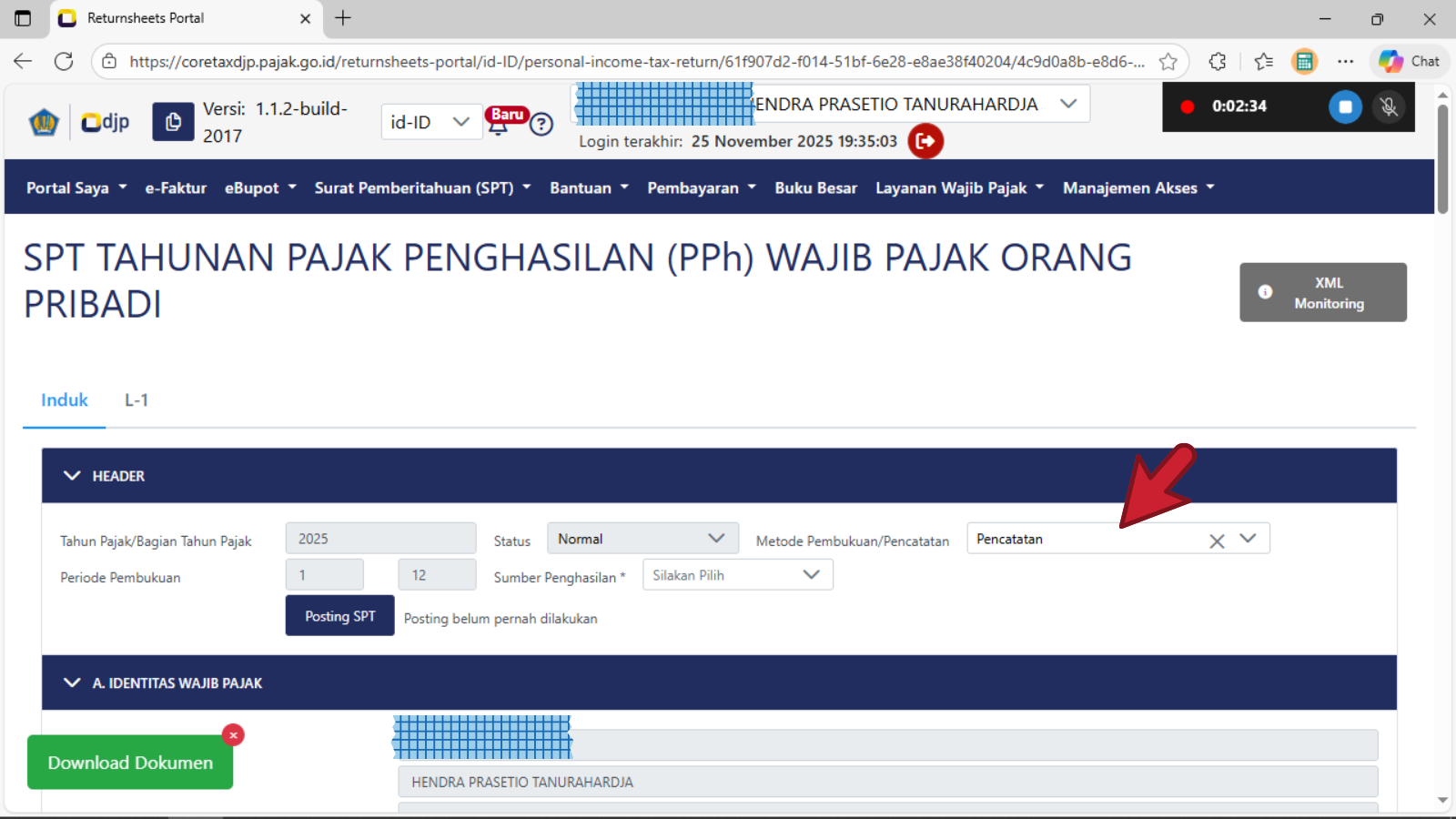 Setelah berhasil membuat konsep spt tahunan orang pribadi dan tampil laman seperti gambar di atas, maka pastikan di bagian HEADER pemilihan Metode Pembukuan/Pencatatan bagi wajib pajak orang pribadi UMKM adalah : PENCATATAN