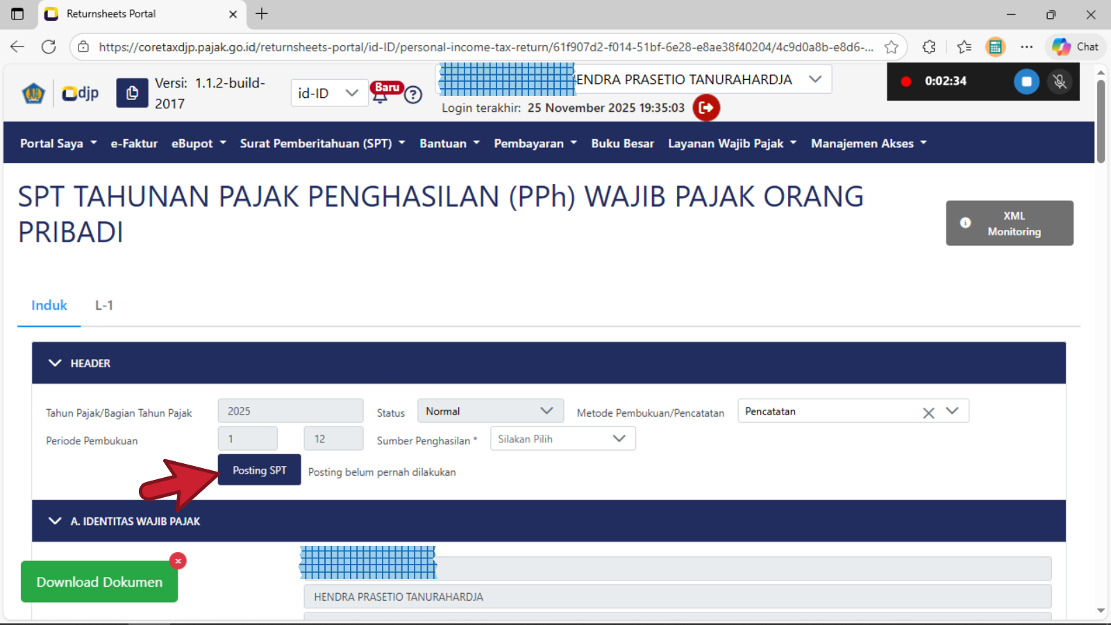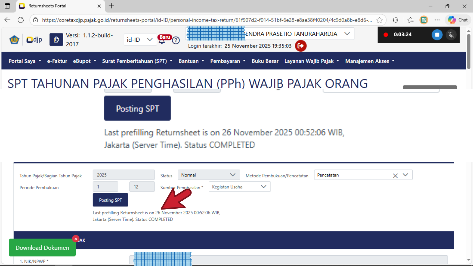 Pastikan setelah menekan tombol Posting SPT dan tampil notifikasi SUCCES, maka akan tampil notifikasi Last Prefiling Returnsheet is on (tanggal bulan thaun posting) | waktu pukul jam+menit+tahun (versi panjang) | angka pukul jam+menit+detik zona | Server Time adalah Jakarta | Status COMPLETED