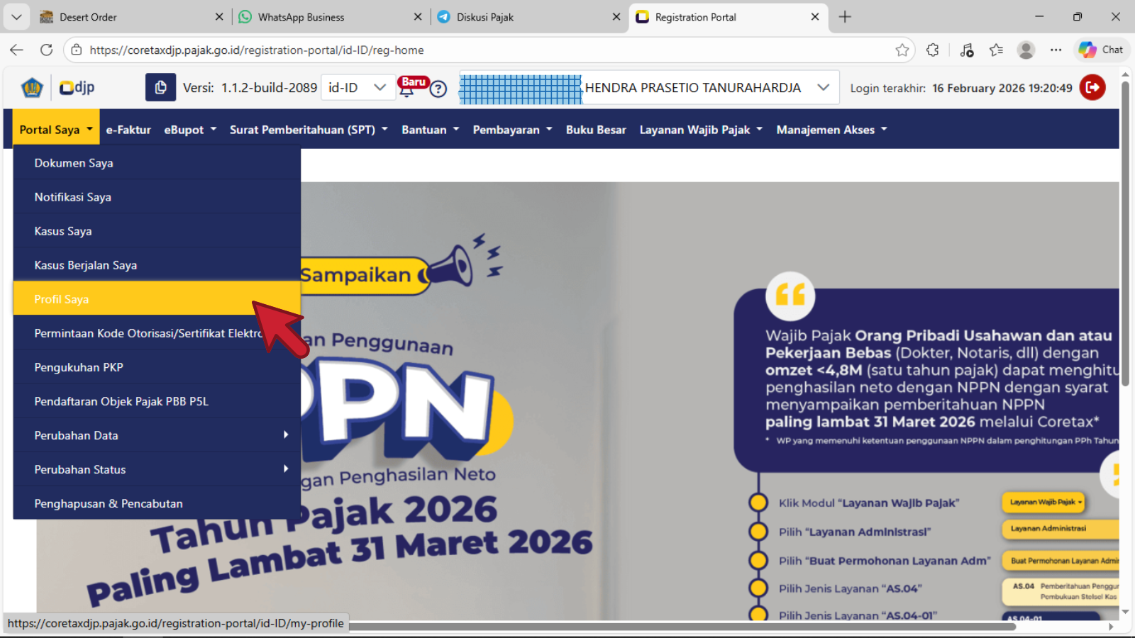 - Pada tangkapan layar di atas adalah laman awal portal Core Tax, pilih modul Portal Saya —> Profil Saya ;