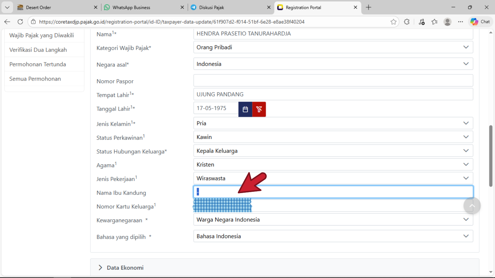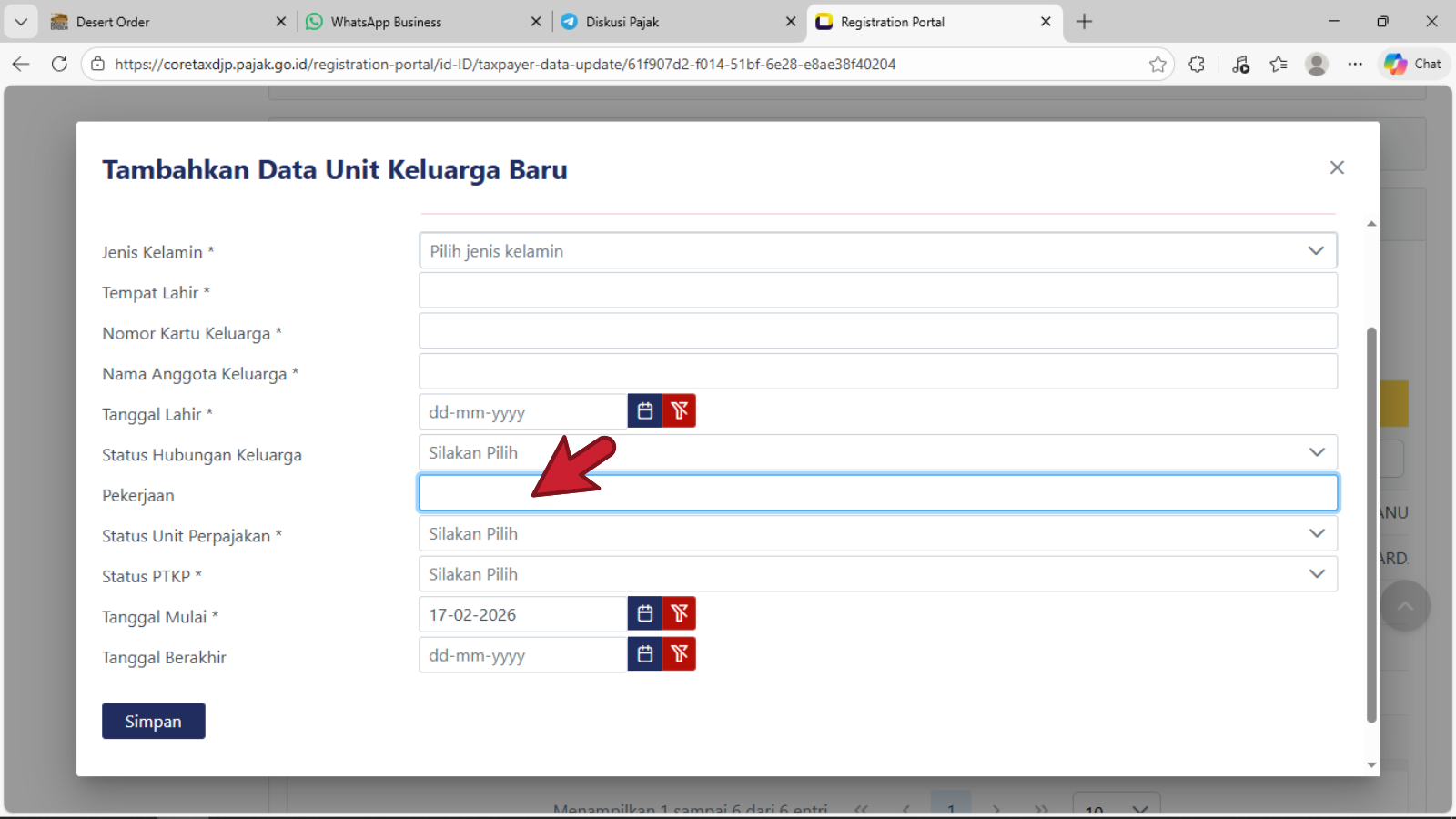 - Perlu diperhatikan adalah pada baris Pekerjaan adalah isikan sesuai dengan kondisi sebenarnya (contoh : Karyawan, Ibu Rumah Tangga dan lain-lain) ;