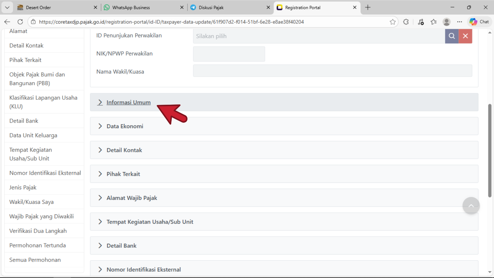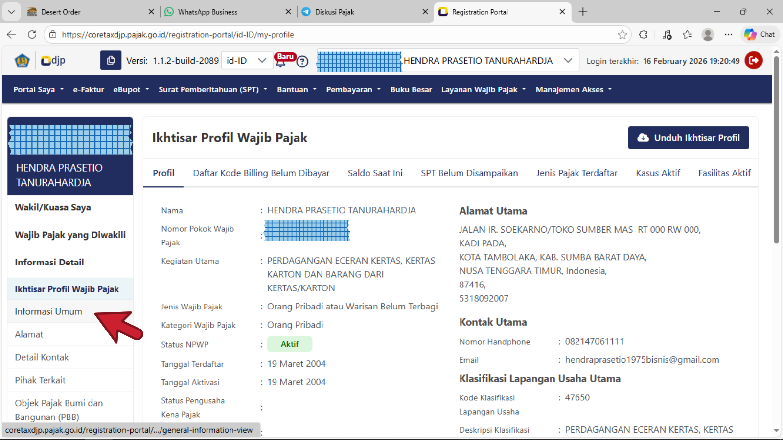 - Pada laman Ikhtisar Profil Wajib Pajak, klik atau pilih Informasi Umum pada menu di samping kiri ;