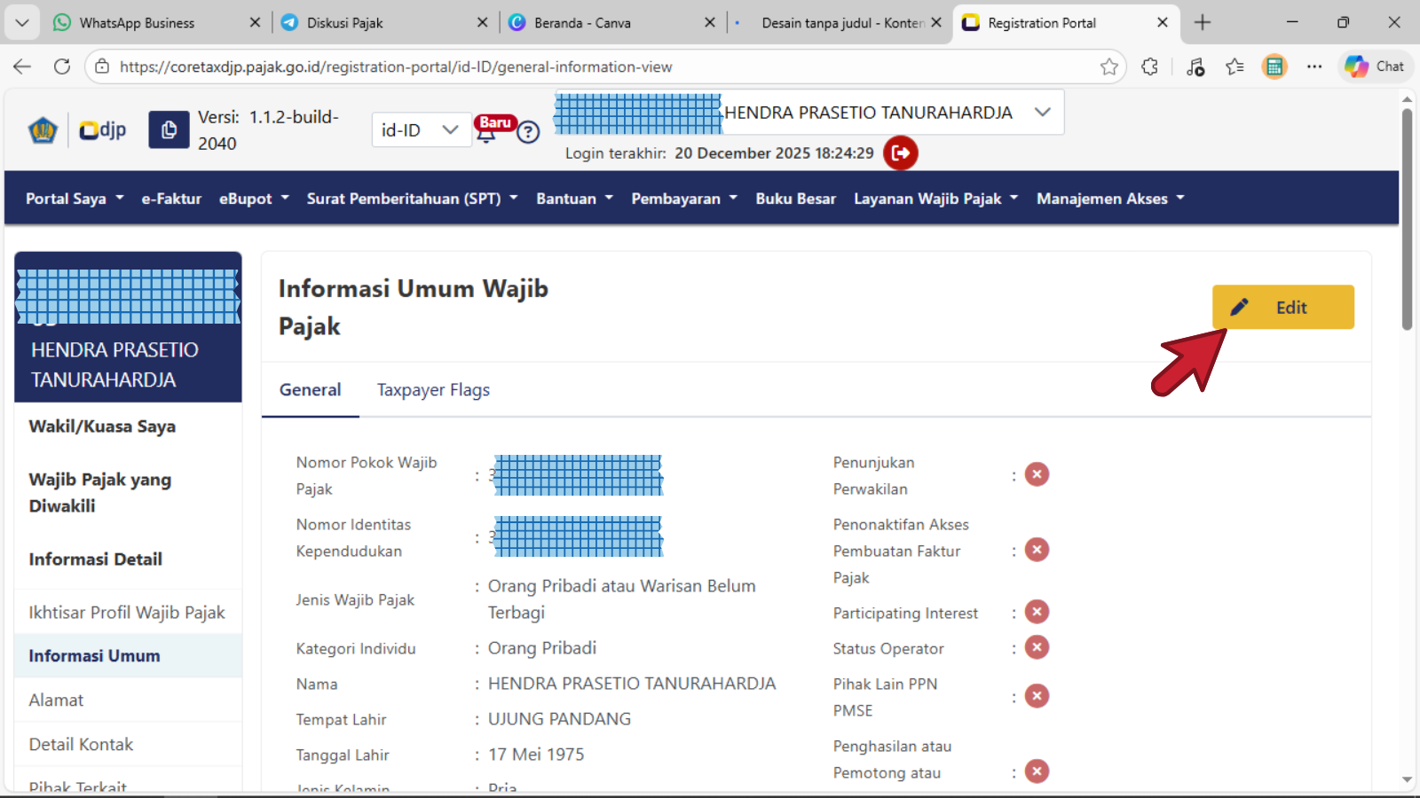 - Pada laman Informasi Umum Wajib Pajak, klik tombol Edit ;