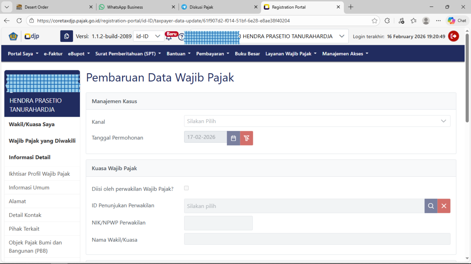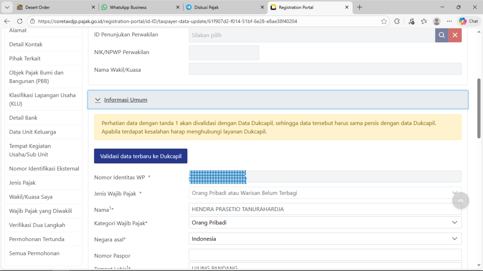 - Pada laman Pembaruan Data Wajib Pajak (tangkapan layar pertama/bagian awal) ;