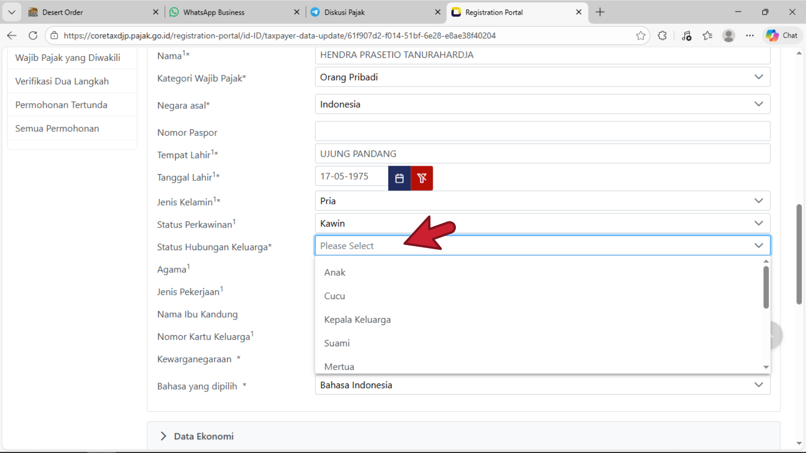 - Gulir laman ke bawah, pilih dari menu pilihan untuk melengkapi Status Hubungan Keluarga, pilih Kepala Keluarga ;