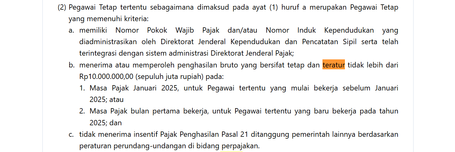 Berdasarkan ketentuan, penentuan kelayakan PPh 21 DTP bagi pegawai tetap mengacu pada penghasilan bruto yang bersifat tetap dan teratur dengan batas maksimal Rp10.000.000 per bulan. Artinya, yang dilihat sebagai dasar fasilitas adalah komponen penghasilan yang: