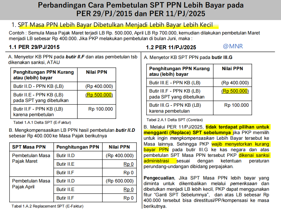 Jawaban: Apabila SPT pembetulan menghasilkan nilai lebih bayar yang lebih kecil, maka selisih kurang bayar (KB) yang timbul harus dilakukan pembayaran. Sementara itu, kompensasi dari SPT normal akan masuk ke dalam dashboard kompensasi SPT normal yang belum dilaporkan. Hal ini berarti, kompensasi yang berasal dari SPT normal akan tetap diperhitungkan untuk masa pajak berikutnya, terlepas dari perubahan nilai lebih bayar pada SPT pembetulan masa sebelumnya.