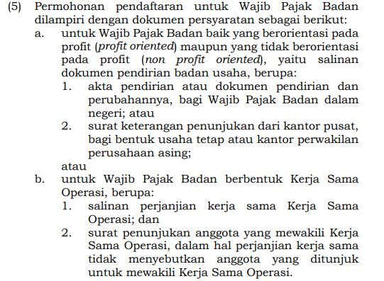 Saat mengajukan permohonan, pastikan Anda melampirkan dokumen yang disyaratkan, antara lain dokumen yang menunjukkan pendirian atau pembentukan Badan dan perubahannya. Detail mengenai dokumen persyaratan ini dapat Anda lihat pada Pasal 14 ayat (5) PER-7/PJ/2025.
