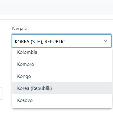 Untuk pemilihan negara Korea Selatan, pilih salah satu saja, “Korea, Republik” atau “KOREA (STH), REPUBLIC”.