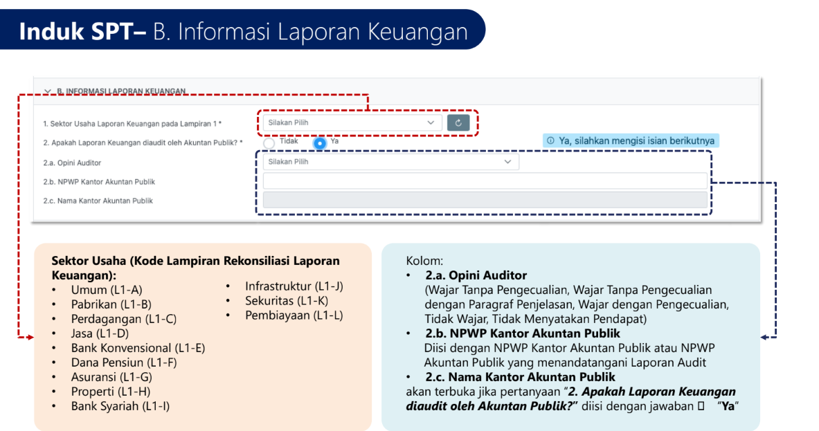 - B. Informasi Laporan Keuangan: Meminta pemilihan sektor usaha (misalnya Umum, Pabrikan, Perdagangan, Jasa) dan pertanyaan apakah laporan keuangan diaudit oleh Akuntan Publik. Jika ya, perlu mengisi opini auditor, NPWP, dan nama Kantor Akuntan Publik.