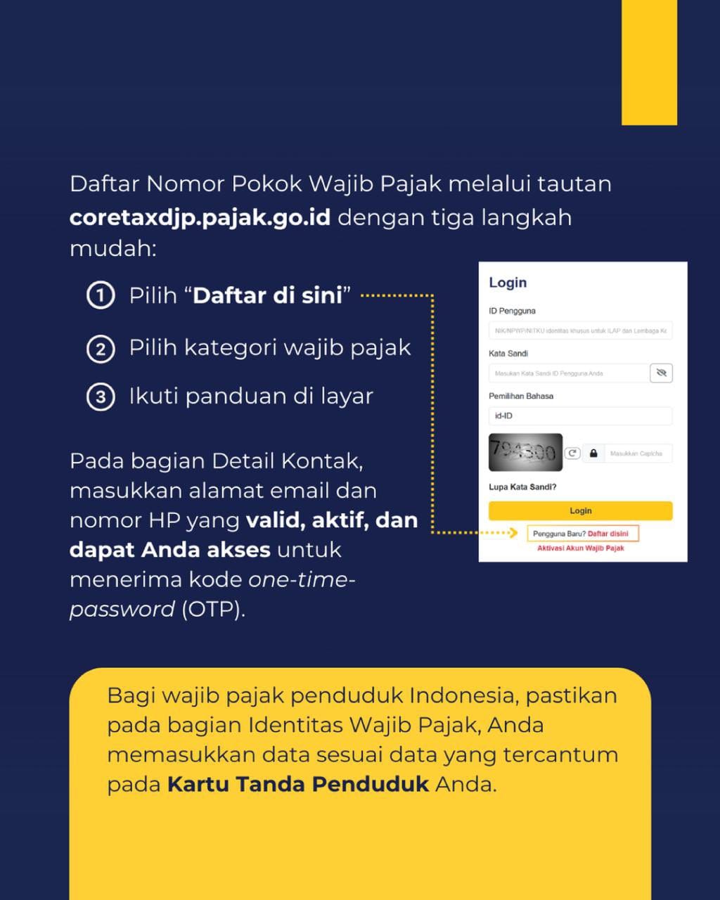 Terkait dengan kendala tidak diterimanya Kode Verifikasi Sekali Pakai (OTP) pada proses pendaftaran Nomor Pokok Wajib Pajak (NPWP) melalui nomor telepon seluler, pengguna diwajibkan untuk memastikan beberapa hal berikut: