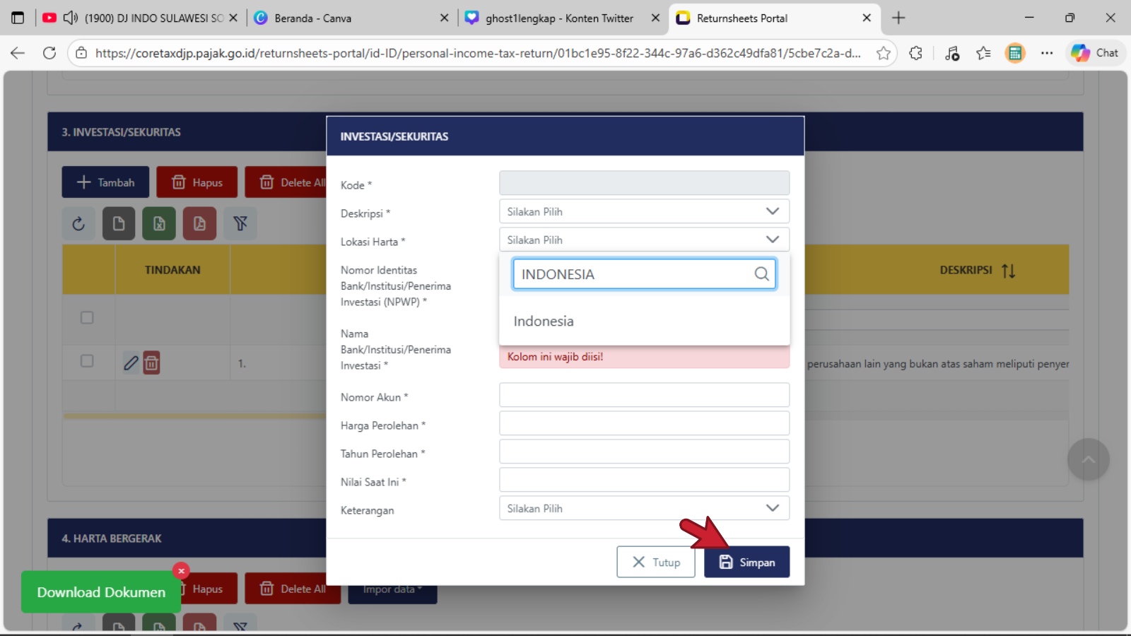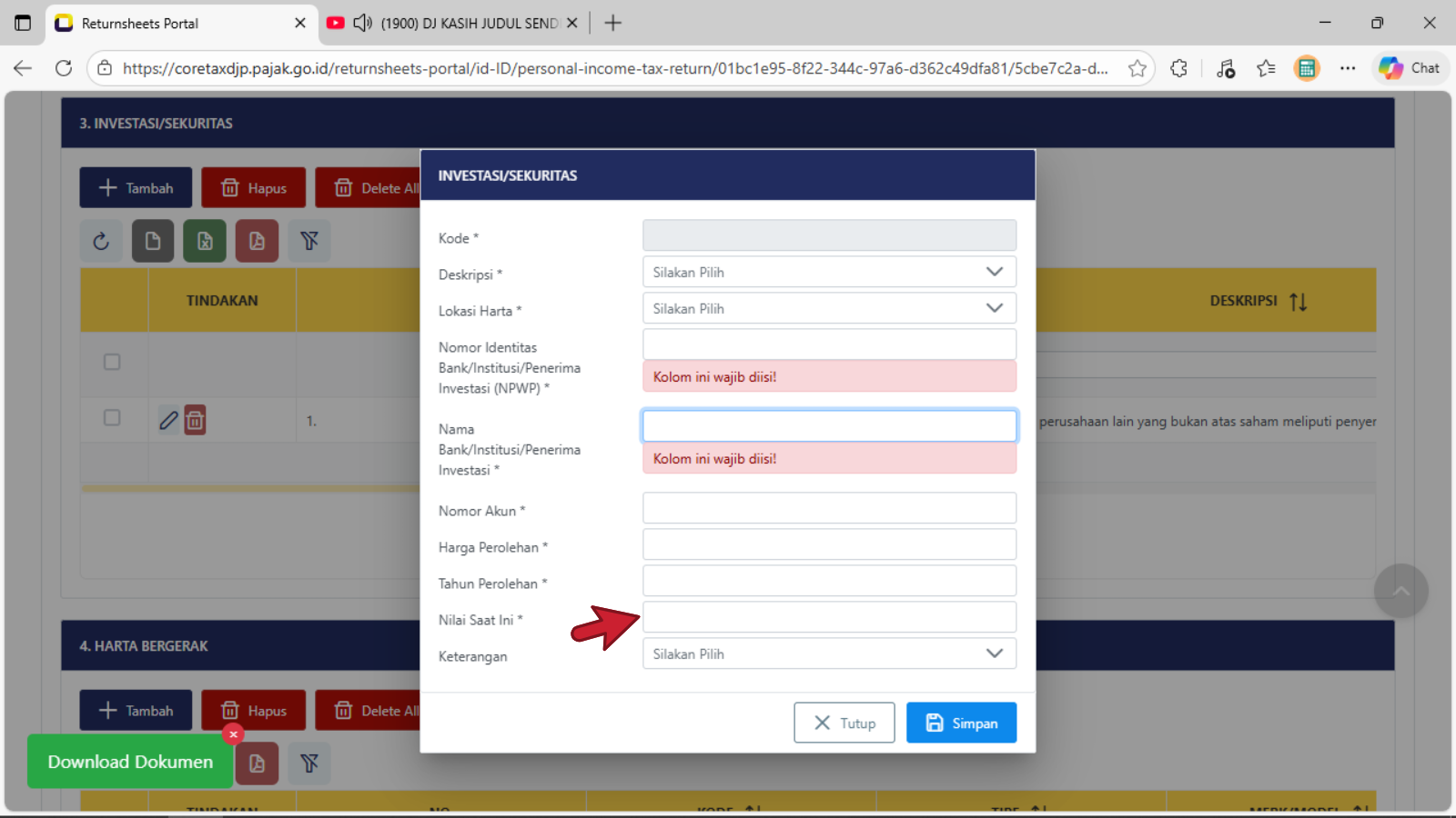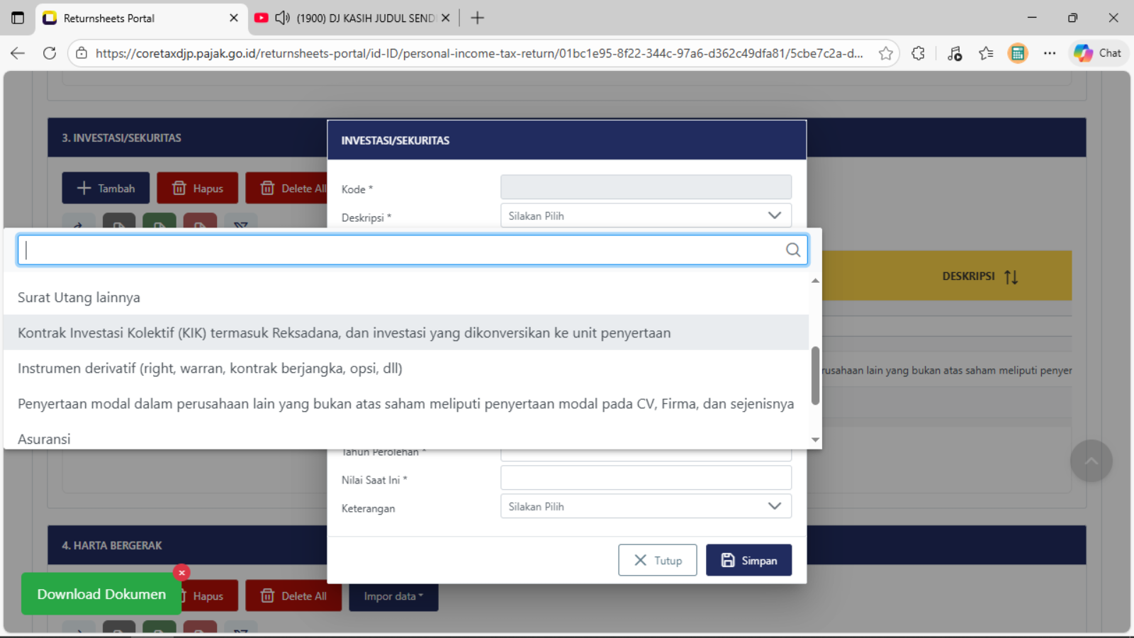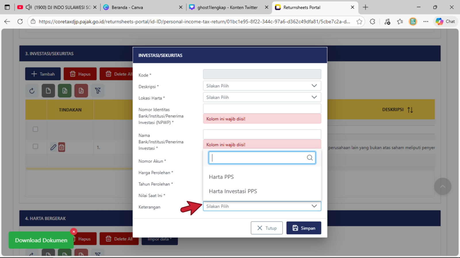 Klik tombol + Tambah untuk menambahkan harta baru yang diperoleh di tahun 2025Tampil tabel isian tampilan pertama baru Investasi/Sekuritas, pengisian dimulai pada baris Deskripsi (pilih salah satu judul harta investasi/sekuritas yang cocok atau yang mendekati)Tampil tabel isian pilihan tampilan kedua baru Investasi/Sekuritas, pengisian dimulai pada baris Deskripsi (pilih salah satu judul harta investasi/sekuritas yang cocok atau yang mendekati)Tampil tabel isian pilihan tampilan ketiga baru Investasi/Sekuritas, pengisian dimulai pada baris Deskripsi (pilih salah satu judul harta investasi/sekuritas yang cocok atau yang mendekati dan sesuai dengan kondisi/keadaan sebenarnya)Baris Lokasi Harta : isikan dengan memilih nama NEGARA dimana atau ditempatkan atau di investasikan untuk harta investasi/sekuritasBaris Nomor Identitas Bank/Institusi/Penerima Investasi (NPWP) : isikan dengan pengisian 16 digit NPWPBaris Nama Bank/Institusi/Penerima Investasi : isikan dengan Nama lengkap sebenarnya Bank/Institusi/Penerima InvestasiBaris Nomor Akun : isikan dengan data penomeran atau register sah dan terdataBaris Harga Perolehan : isikan dengan nominal harga saat dibentuknya harta investasi/SekuritasBaris Tahun Perolehan : isikan dengan Tahun Perolehan saat dibentuknya atau di miliki harta investasi/sekuritasBaris Nilai Saat Ini : isikan dengan nominal harga sesuai dengan data yang dikeluarkan oleh Bank/Institusi/Penerima Investasi yang disampaikanBaris Keterangan : dapat dipilih sesuai dengan kondisi sebenarnya, jika tidak terkait dengan Harta PPS atau Harta Investasi PPS, maka dapat di lewatkan atau tidak di pilih pada daftar pilihanKlik atau pilih tombol Simpan jika sudah selesai mengisi data pada tiap baris