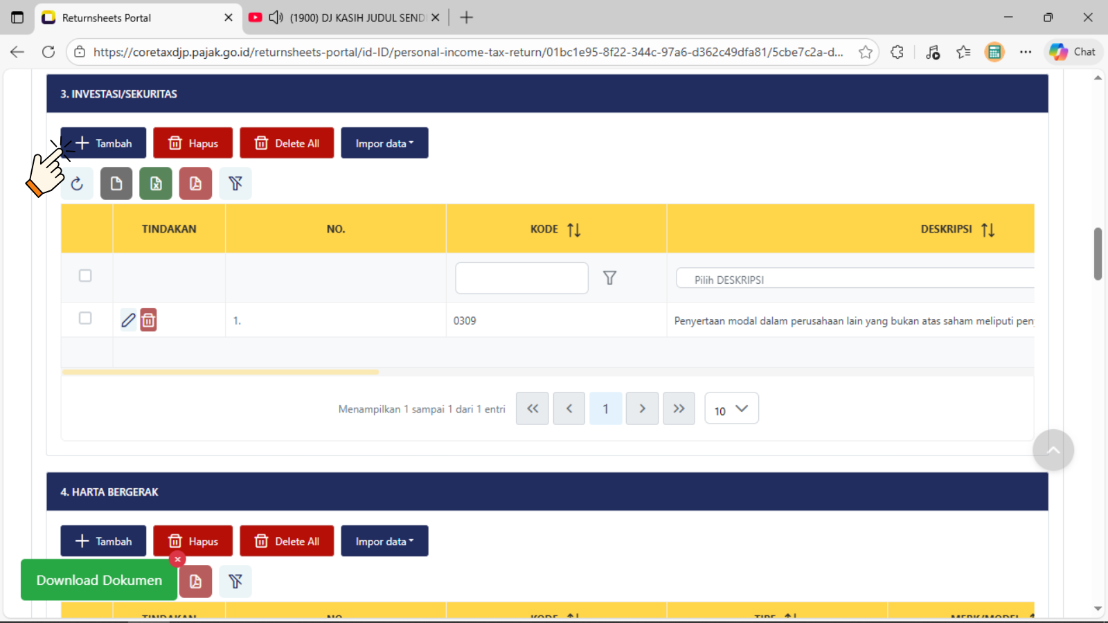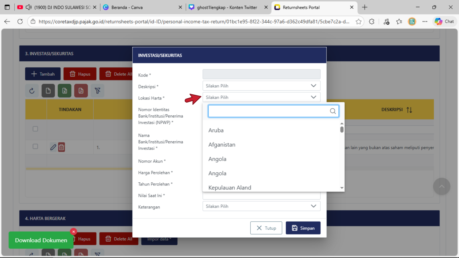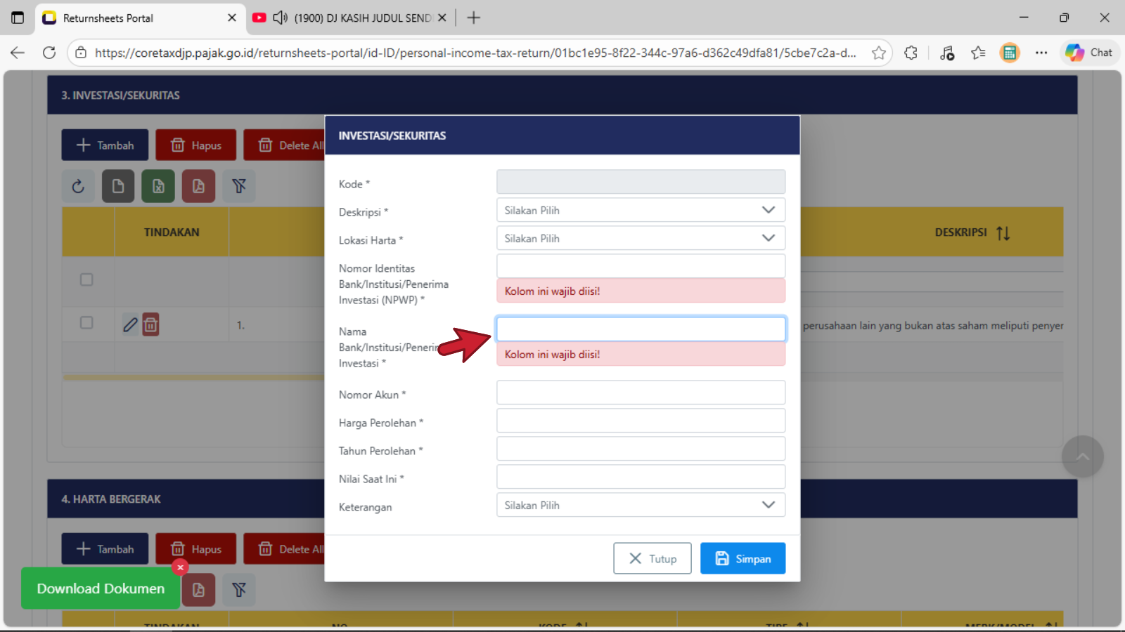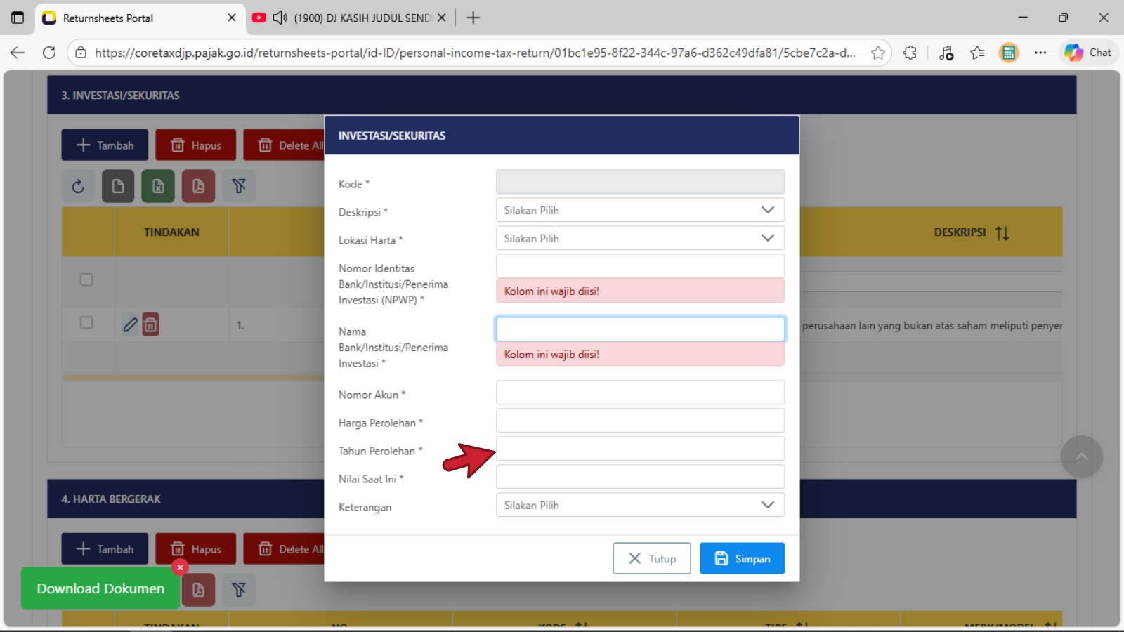 Klik tombol + Tambah untuk menambahkan harta baru yang diperoleh di tahun 2025Tampil tabel isian tampilan pertama baru Investasi/Sekuritas, pengisian dimulai pada baris Deskripsi (pilih salah satu judul harta investasi/sekuritas yang cocok atau yang mendekati)Tampil tabel isian pilihan tampilan kedua baru Investasi/Sekuritas, pengisian dimulai pada baris Deskripsi (pilih salah satu judul harta investasi/sekuritas yang cocok atau yang mendekati)Tampil tabel isian pilihan tampilan ketiga baru Investasi/Sekuritas, pengisian dimulai pada baris Deskripsi (pilih salah satu judul harta investasi/sekuritas yang cocok atau yang mendekati dan sesuai dengan kondisi/keadaan sebenarnya)Baris Lokasi Harta : isikan dengan memilih nama NEGARA dimana atau ditempatkan atau di investasikan untuk harta investasi/sekuritasBaris Nomor Identitas Bank/Institusi/Penerima Investasi (NPWP) : isikan dengan pengisian 16 digit NPWPBaris Nama Bank/Institusi/Penerima Investasi : isikan dengan Nama lengkap sebenarnya Bank/Institusi/Penerima InvestasiBaris Nomor Akun : isikan dengan data penomeran atau register sah dan terdataBaris Harga Perolehan : isikan dengan nominal harga saat dibentuknya harta investasi/SekuritasBaris Tahun Perolehan : isikan dengan Tahun Perolehan saat dibentuknya atau di miliki harta investasi/sekuritasBaris Nilai Saat Ini : isikan dengan nominal harga sesuai dengan data yang dikeluarkan oleh Bank/Institusi/Penerima Investasi yang disampaikanBaris Keterangan : dapat dipilih sesuai dengan kondisi sebenarnya, jika tidak terkait dengan Harta PPS atau Harta Investasi PPS, maka dapat di lewatkan atau tidak di pilih pada daftar pilihanKlik atau pilih tombol Simpan jika sudah selesai mengisi data pada tiap baris