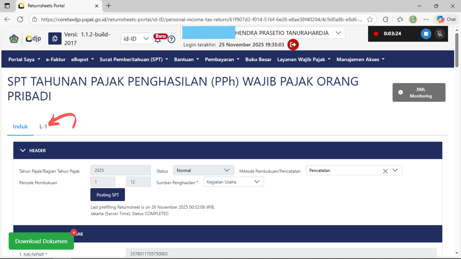 Pilih/KLIK sub menu lampiran L-1 pada halaman induk spt tahunan PPh wajib pajak orang pribadi