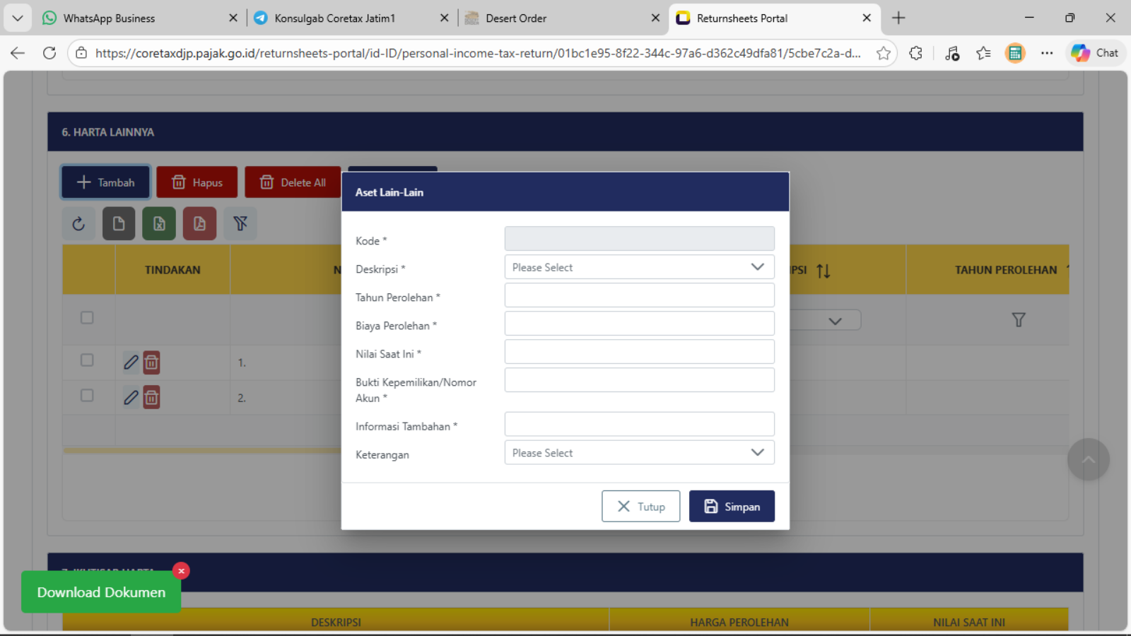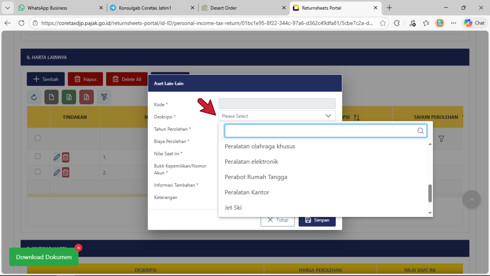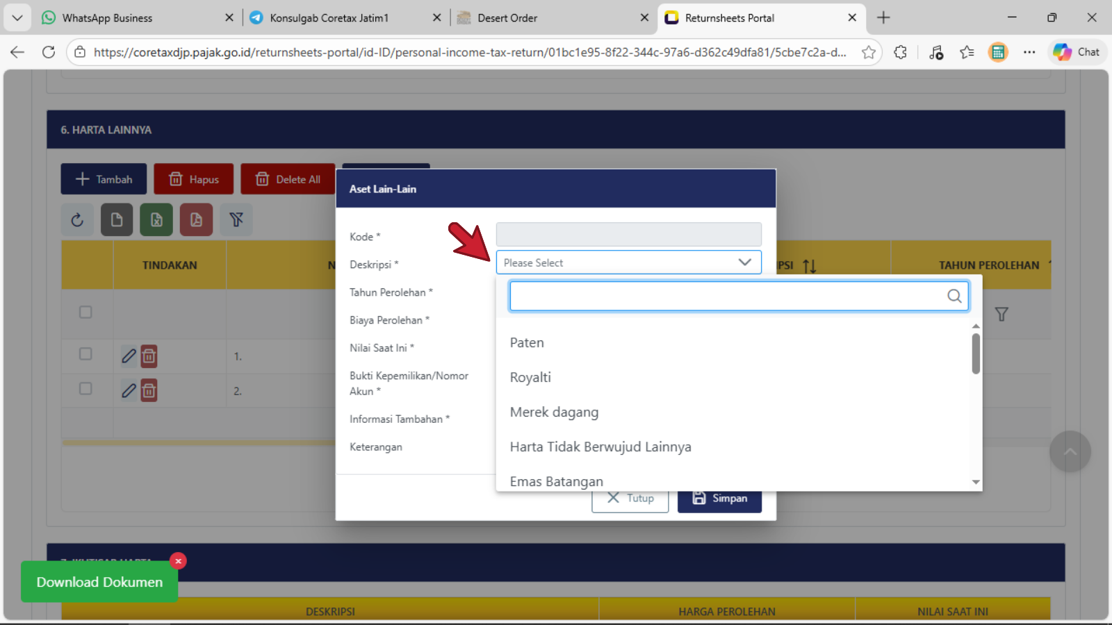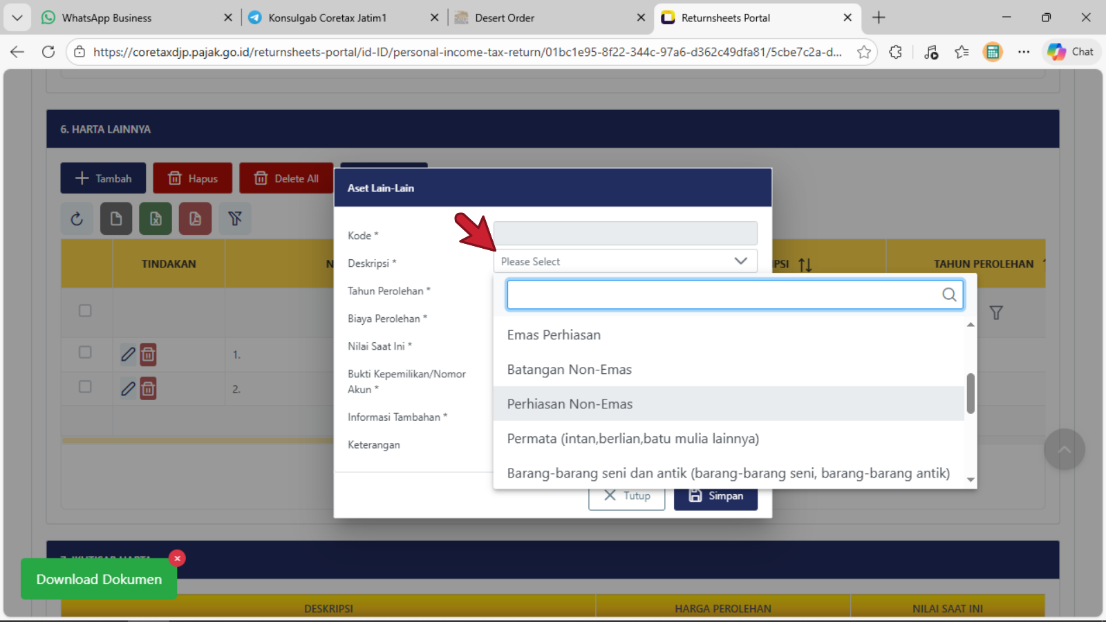 Tampilan data harta spt tahunan tahun 2024 yang telah diposting pada konsep spt tahunan (PPh) tahun 2025, otomatis oleh sistem telah di sesuaikan dengan kode jenis harta.Klik icon atau lambang pensil untuk melengkapi kolom tabel yang belum terisiklik tombol atau icon tong sampah untuk menghapus data harta lainnya yang telah tidak dimiliki hingga akhir tahun pajak 2025Klik tombol + Tambah untuk menambahkan harta lainnyaTampil tabel Harta Lainnya untuk di isi isian data pada seluruh barisnya, dikarenakan ada tanda baca bintang (*), maka wajib diisi sesuai dengan karakter atau jenis harta, jika tidak diisi, maka akan tampil notifikasi kolom ini wajib diisi!Untuk pengisian, pilih menu pilihan pada baris Deskripsi, tampilan pertama daftar pilihan judul/nama harta lainnya : Paten, Royalti, Merek Dagang, Harta Tida Berwujud Lainnya, Emas BatanganUntuk pengisian, pilih menu pilihan pada baris Deskripsi, tampilan kedua daftar pilihan judul/nama harta lainnya : Emas Perhiasan, Batangan Non Emas, Perhiasan Non Emas, Permata (intan, berlian, batu mulia lainnya), Barang-barang Seni dan Antik (barang-barang seni, barang-barang antik)Untuk pengisian, pilih menu pilihan pada baris Deskripsi, tampilan ketiga daftar pilihan judul/nama harta lainnya : Peralatan Olah Raga Khusus, Peralatan Elektronik, Perabot Rumah Tangga, Peralatan Kantor, Jet SkiUntuk pengisian, pilih menu pilihan pada baris Deskripsi, tampilan keempat daftar pilihan judul/nama harta lainnya : Persediaan Usaha dan Harta Lainnya.Untuk baris Tahun Perolehan : isikan tahun diperolehnya harta tidak bergerak, baris Biaya Perolehan : isikan nominal keuangan saat mendapatkan harta lainnya tersebut, baris Nilai Saat ini : isikan dengan nominal keuangan per tanggal 31 Desember 2025, baris Bukti Kepemilikan/Nomor Akun : isikan nomor register/bukti pembelian atau bukti tertulis lainnya, baris Informasi Tambahan : dapat diisi dengan karakter atau wujud atau kondisi harta lainnya tersebut, baris Keterangan : dapat dipilih jika terkait dengan harta PPS atau harta investasi PPS, jika tidak terkait maka dapat dilewati atau tidak dipilih, setelah semua telah terisi, teken tombol Simpan.