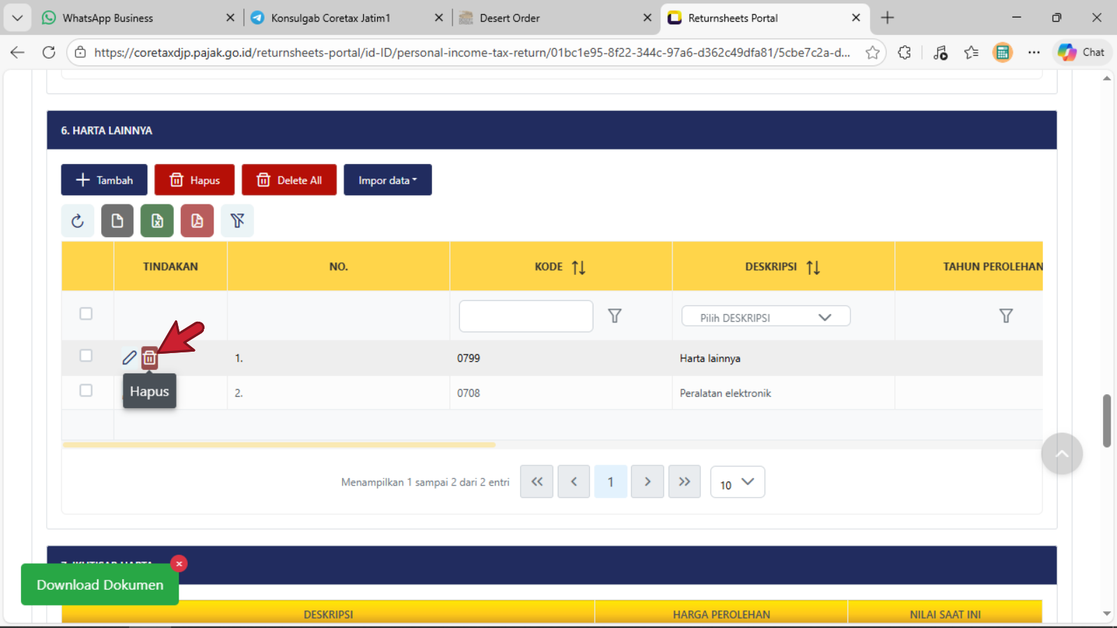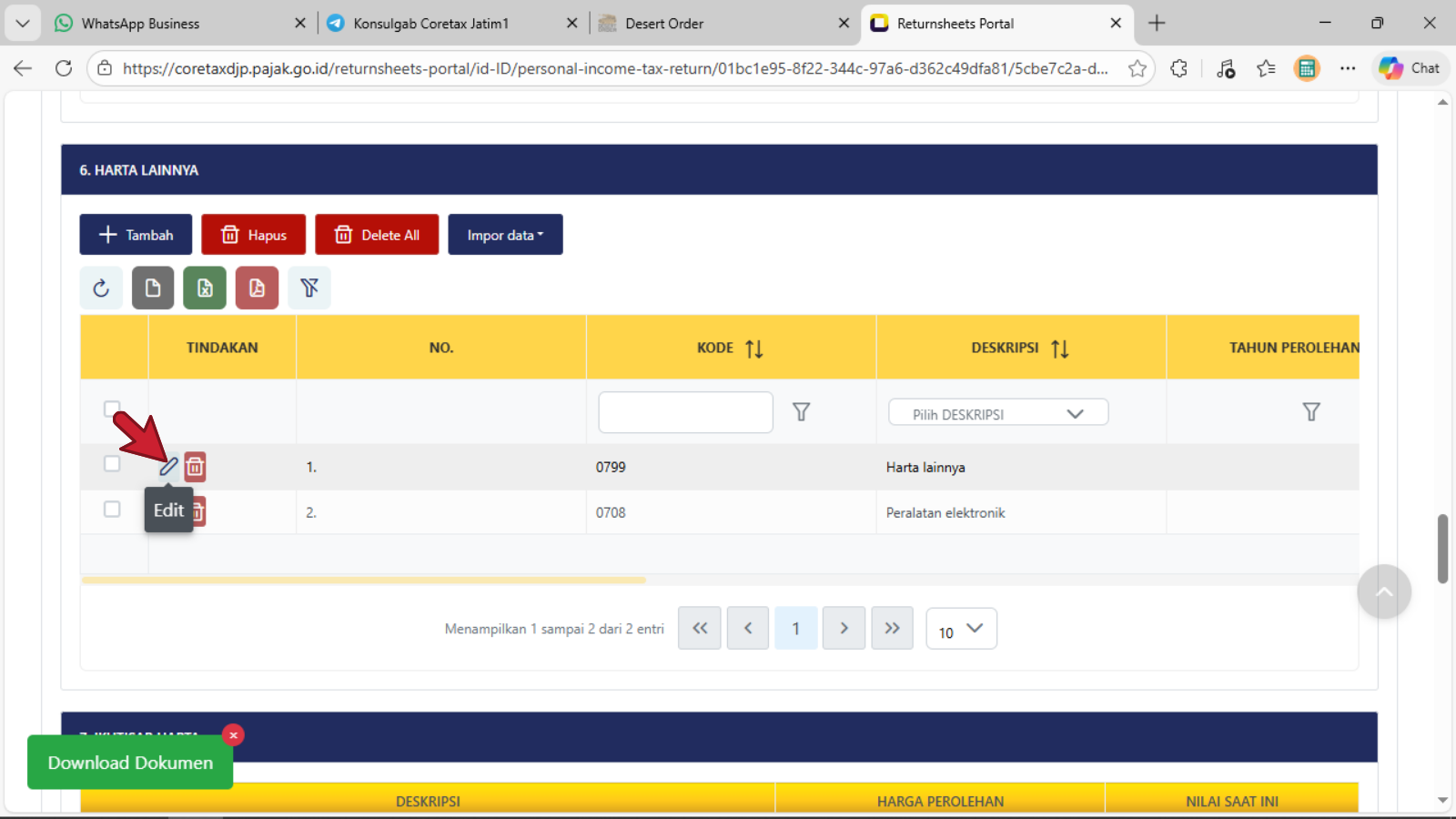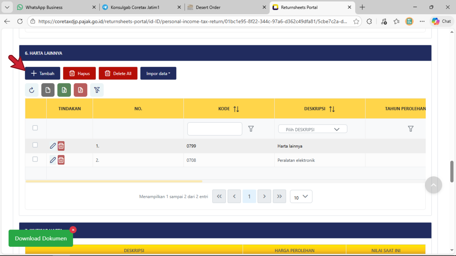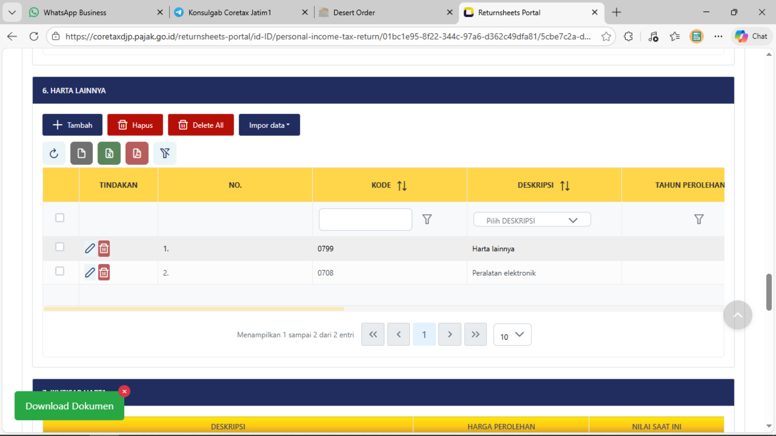 Tampilan data harta spt tahunan tahun 2024 yang telah diposting pada konsep spt tahunan (PPh) tahun 2025, otomatis oleh sistem telah di sesuaikan dengan kode jenis harta.Klik icon atau lambang pensil untuk melengkapi kolom tabel yang belum terisiklik tombol atau icon tong sampah untuk menghapus data harta lainnya yang telah tidak dimiliki hingga akhir tahun pajak 2025Klik tombol + Tambah untuk menambahkan harta lainnyaTampil tabel Harta Lainnya untuk di isi isian data pada seluruh barisnya, dikarenakan ada tanda baca bintang (*), maka wajib diisi sesuai dengan karakter atau jenis harta, jika tidak diisi, maka akan tampil notifikasi kolom ini wajib diisi!Untuk pengisian, pilih menu pilihan pada baris Deskripsi, tampilan pertama daftar pilihan judul/nama harta lainnya : Paten, Royalti, Merek Dagang, Harta Tida Berwujud Lainnya, Emas BatanganUntuk pengisian, pilih menu pilihan pada baris Deskripsi, tampilan kedua daftar pilihan judul/nama harta lainnya : Emas Perhiasan, Batangan Non Emas, Perhiasan Non Emas, Permata (intan, berlian, batu mulia lainnya), Barang-barang Seni dan Antik (barang-barang seni, barang-barang antik)Untuk pengisian, pilih menu pilihan pada baris Deskripsi, tampilan ketiga daftar pilihan judul/nama harta lainnya : Peralatan Olah Raga Khusus, Peralatan Elektronik, Perabot Rumah Tangga, Peralatan Kantor, Jet SkiUntuk pengisian, pilih menu pilihan pada baris Deskripsi, tampilan keempat daftar pilihan judul/nama harta lainnya : Persediaan Usaha dan Harta Lainnya.Untuk baris Tahun Perolehan : isikan tahun diperolehnya harta tidak bergerak, baris Biaya Perolehan : isikan nominal keuangan saat mendapatkan harta lainnya tersebut, baris Nilai Saat ini : isikan dengan nominal keuangan per tanggal 31 Desember 2025, baris Bukti Kepemilikan/Nomor Akun : isikan nomor register/bukti pembelian atau bukti tertulis lainnya, baris Informasi Tambahan : dapat diisi dengan karakter atau wujud atau kondisi harta lainnya tersebut, baris Keterangan : dapat dipilih jika terkait dengan harta PPS atau harta investasi PPS, jika tidak terkait maka dapat dilewati atau tidak dipilih, setelah semua telah terisi, teken tombol Simpan.